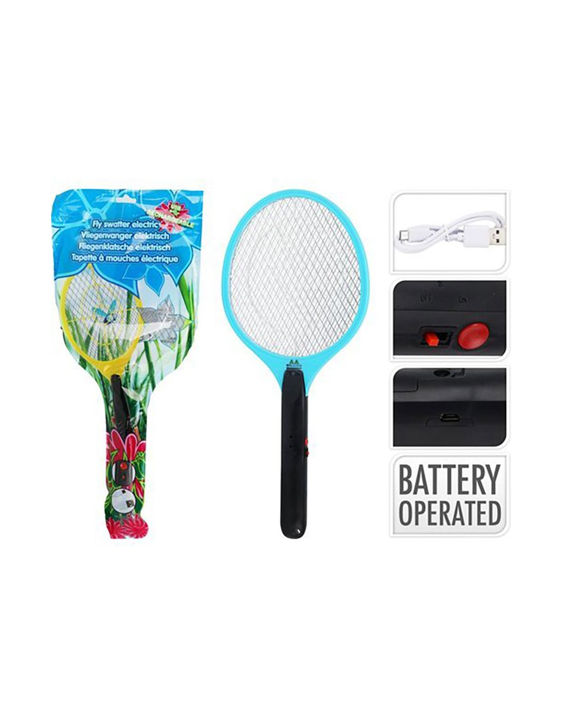 Raqueta mata moscas, mosquitos, etc por contacto. recargable con cable usb (incluído), funciona con baterías recargables incluídas (1 x 3,7 v 18650 lithium-ion, 1200mah). características apto sólo para ser utilizado por personas adultas, pues produce una pequeña descarga eléctrica. medidas: 48 x 21 cm
