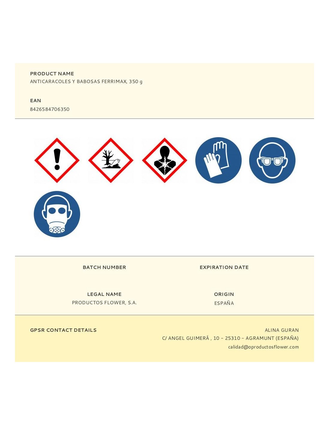 Anticaracoles y babosas ferrimax es un molusquicida en forma de cebo granulado, atractivo para todo tipo de babosas y caracoles que se alimentan de plantas cultivadas. la actividad alimentaria de estas plagas cesa rápidamente una vez ingerido el cebo. de este modo, se alcanza una protección inmediata del cultivo, aun cuando las babosas y los caracoles permanezcan en el área tratada por un corto tiempo. apto para agricultura ecológica