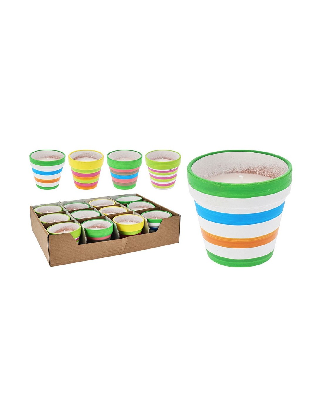 Vela de citronela en maceta de terracota, tiempo de combustión aprox. 12 horas, presentado en expositor de 12 uds, colores surtidos, dimensiones: ø8,5 x 77 mm