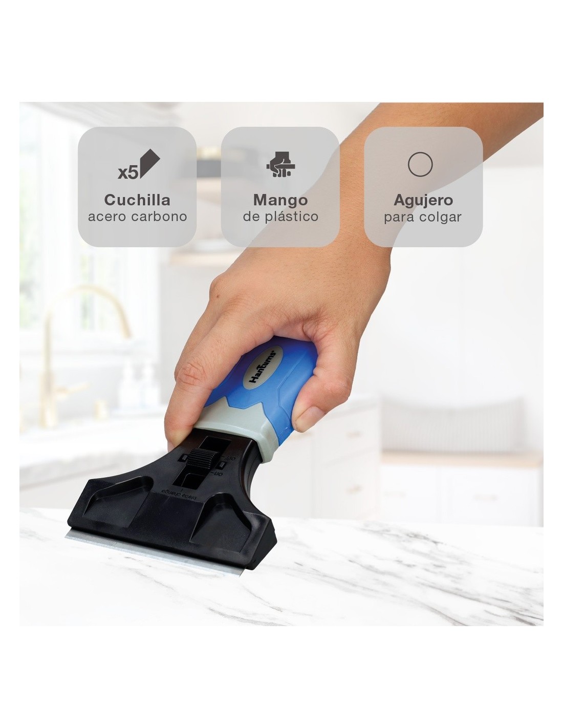 | Ideal para | Quitar restos adheridos sobre azulejos, cristales o cualquier superficie plana. |