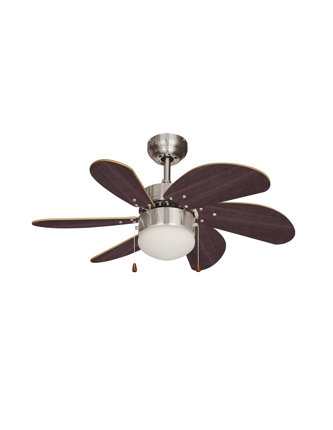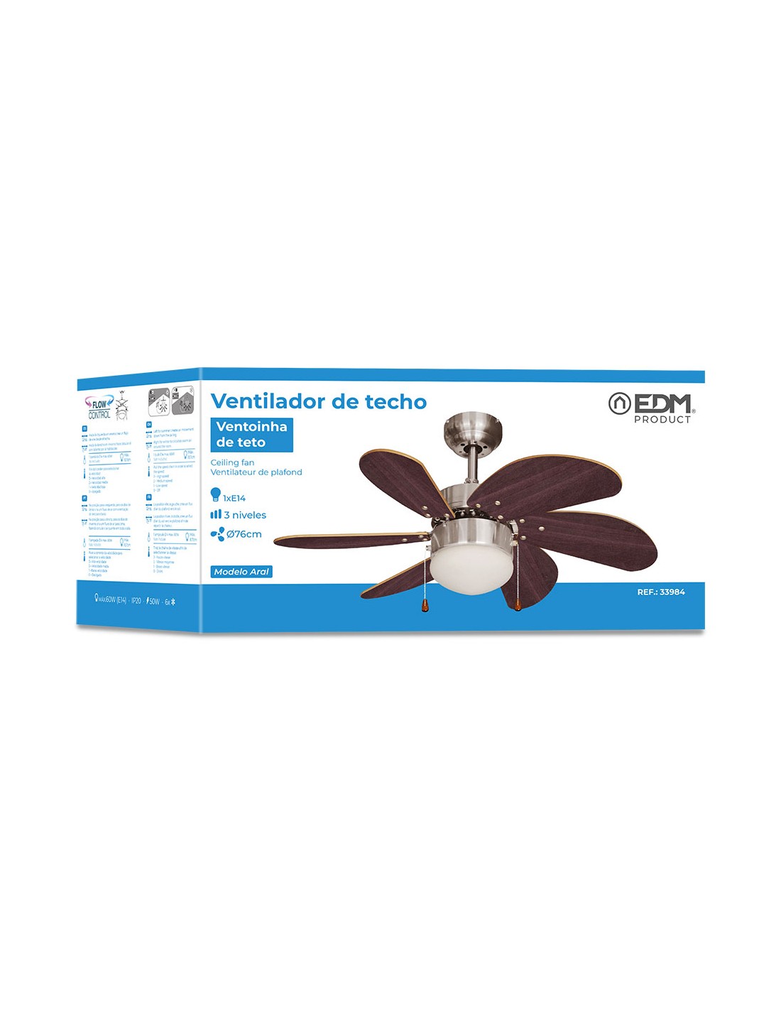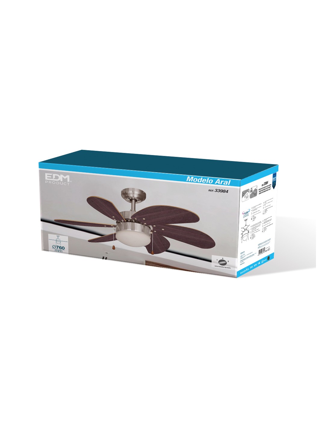 Ventilador de techo modelo aral. color wengue/niquel satinado. potencia: 50w aspas: ø76cm 3 velocidades (interruptor tirador) caudal de aire 4409m/h ac-220-240v 50hz luz (1xe14 max. 60w max. 8,7cm no incluida. interruptor tirador) 6 aspas ip20 edm