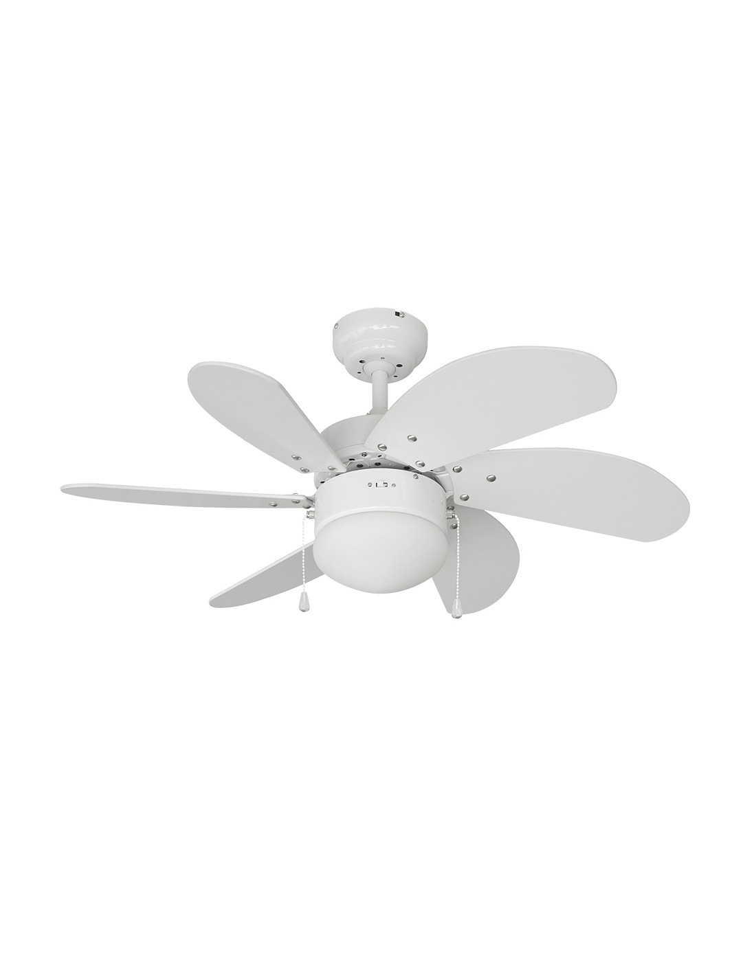 Ventilador de techo modelo aral. color blanco. potencia: 50 w aspas: ø76cm 3 velocidades (interruptor tirador) modo verano y modo invierno caudal de aire 4409 m/h ac-220-240 v 50 hz luz (1x e14 max. 60 w max. 8,7cm no incluida). interruptor tirador, 6 aspas ip20