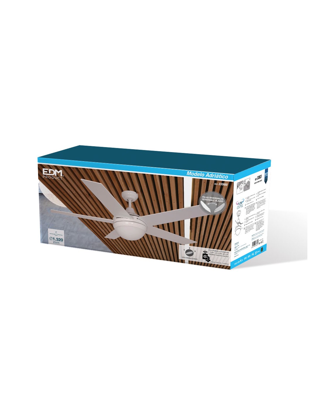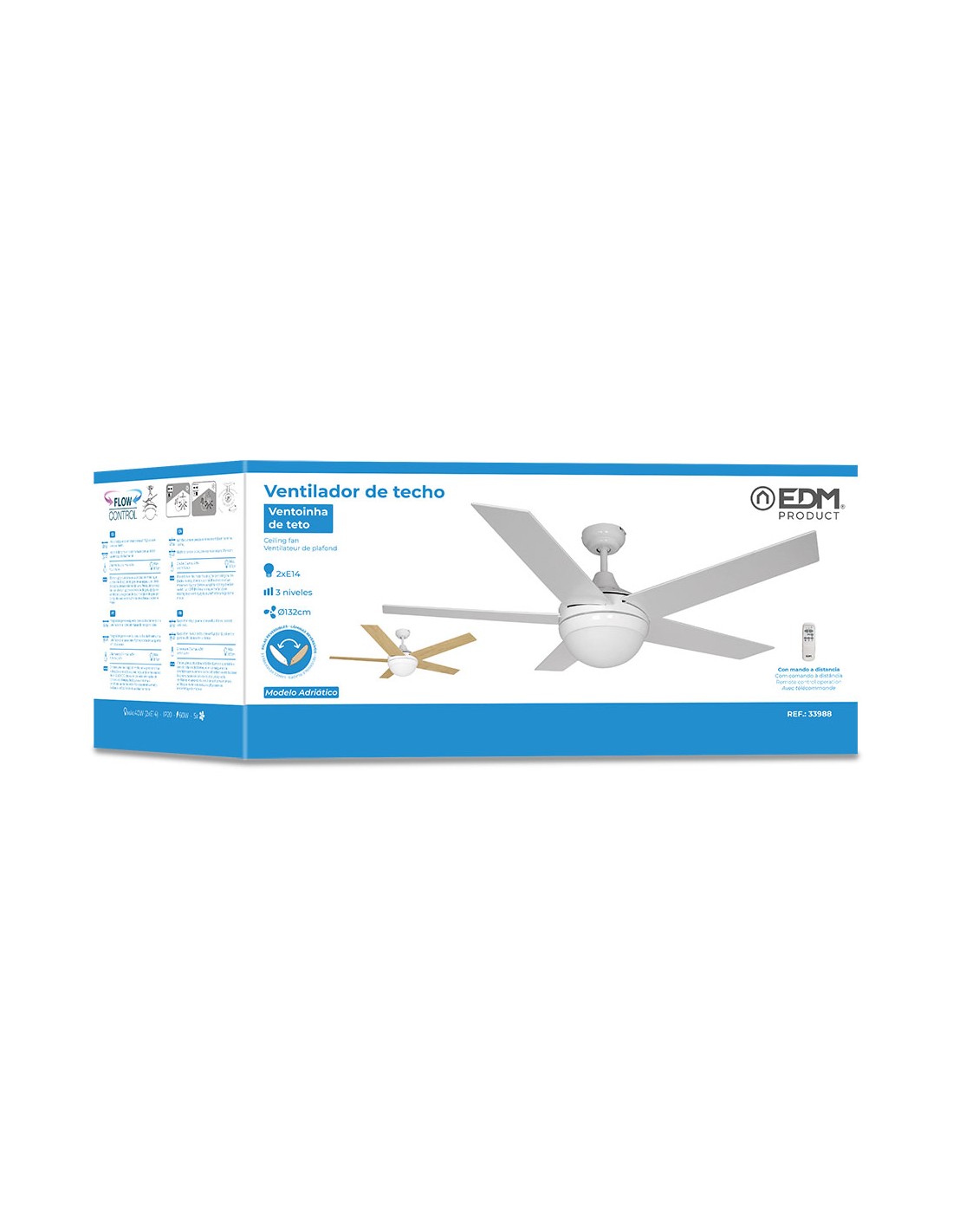 Ventilador de techo modelo adriatico. color blanco. potencia: 60w aspas: ø132cm 3 velocidades. con mando a distancia. caudal de aire 7218m/h ac-220-240v 50hz con luz (2xe14 max. 40w max. 8,7cm no incluidas) 5 aspas reversibles de color blanco/madera ip20 edm
