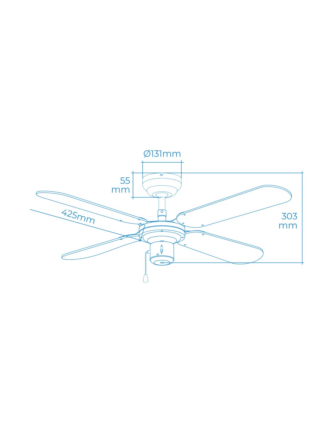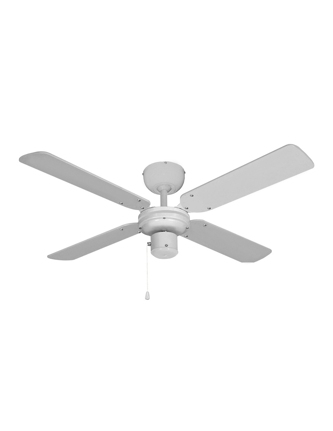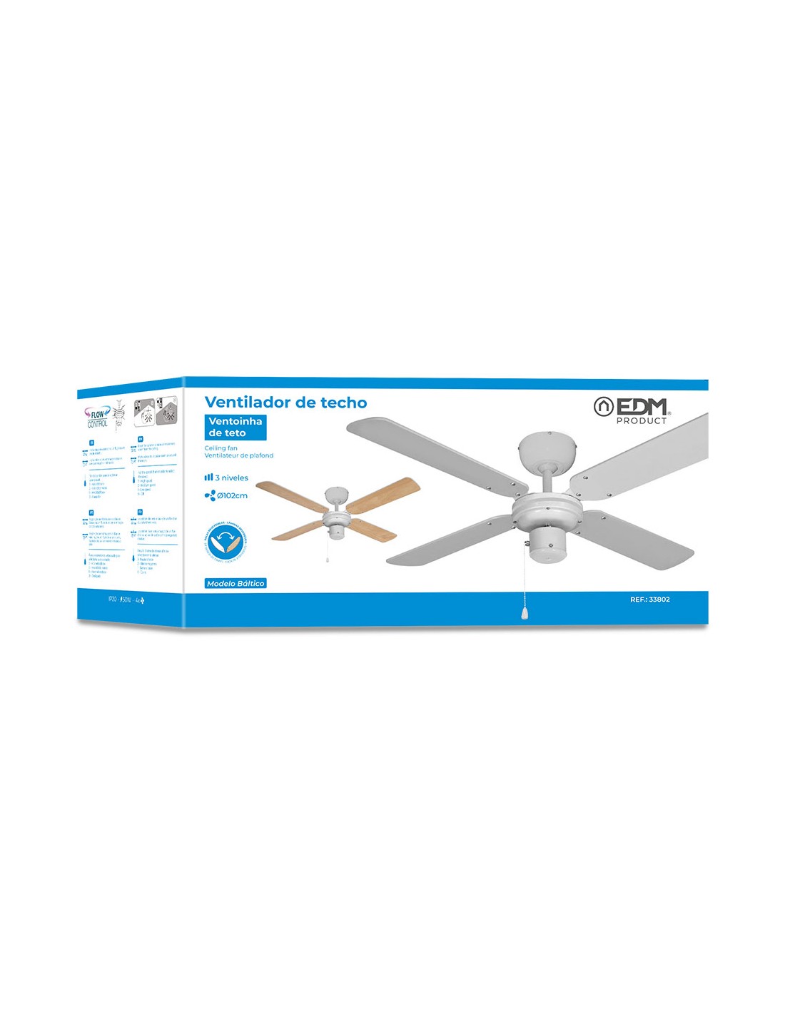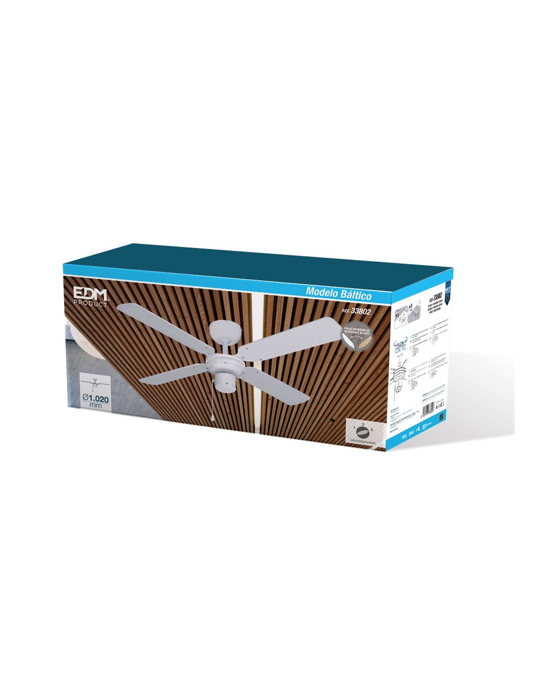 Ventilador de techo modelo baltico. color blanco. potencia: 50w aspas: ø102cm (diámetro) 3 velocidades (interruptor tirador) caudal de aire 4381m/h ac-220-240v 50hz 4 aspas reversibles blanco/haya ip20 edm