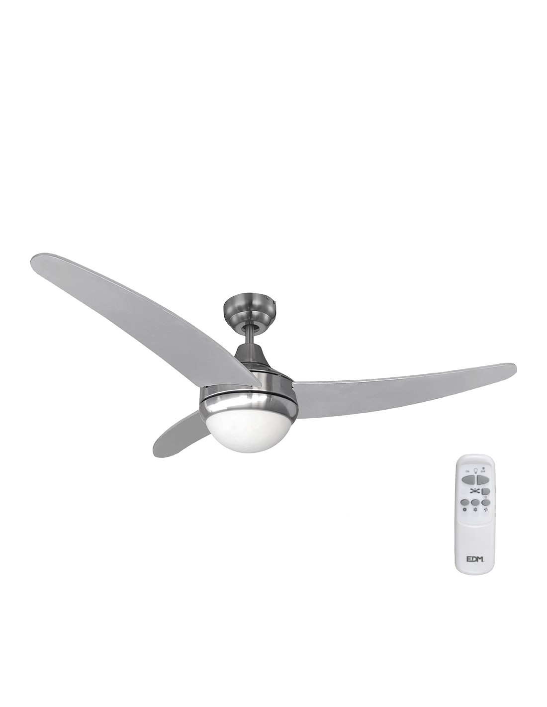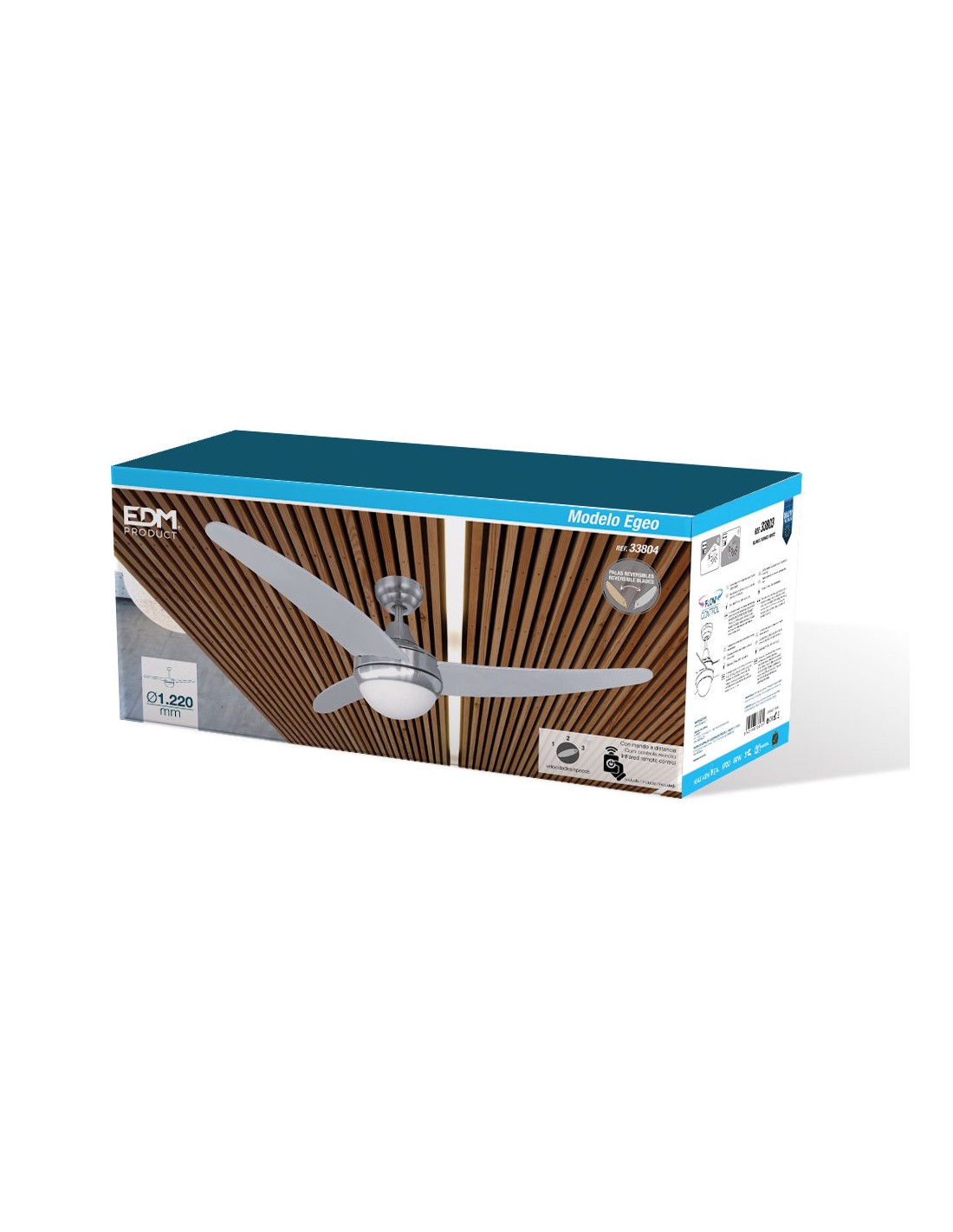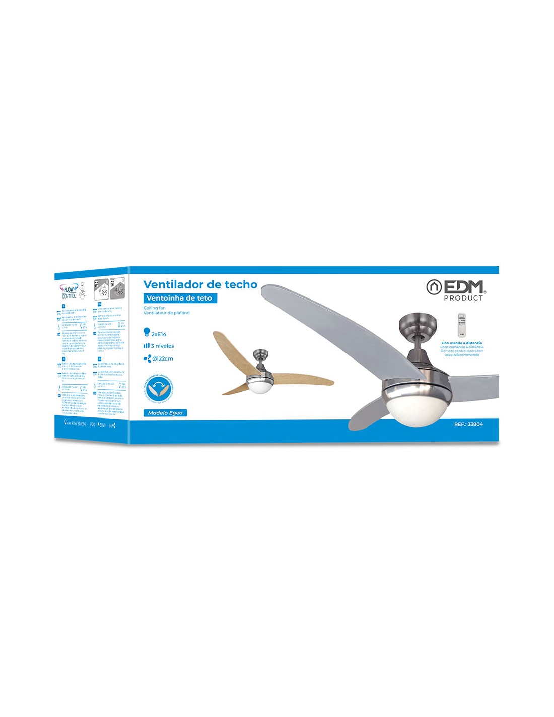 Ventilador de techo modelo egeo. color cromado potencia: 60w aspas: ø122cm 3 velocidades. con mando a distancia. caudal de aire 6961m/h ac-220-240v 50hz con luz (2xe14 max.40w max. 8,7cm no incluidas) 3 aspas ip20 edm