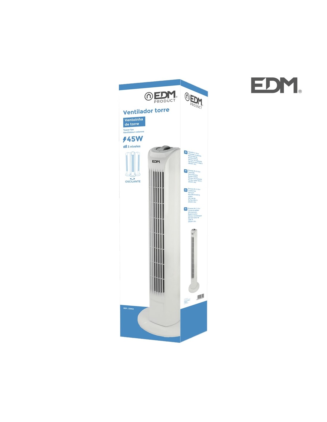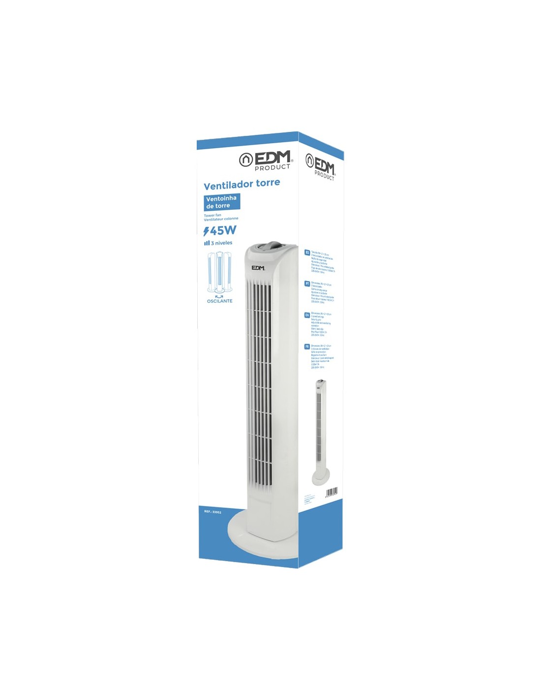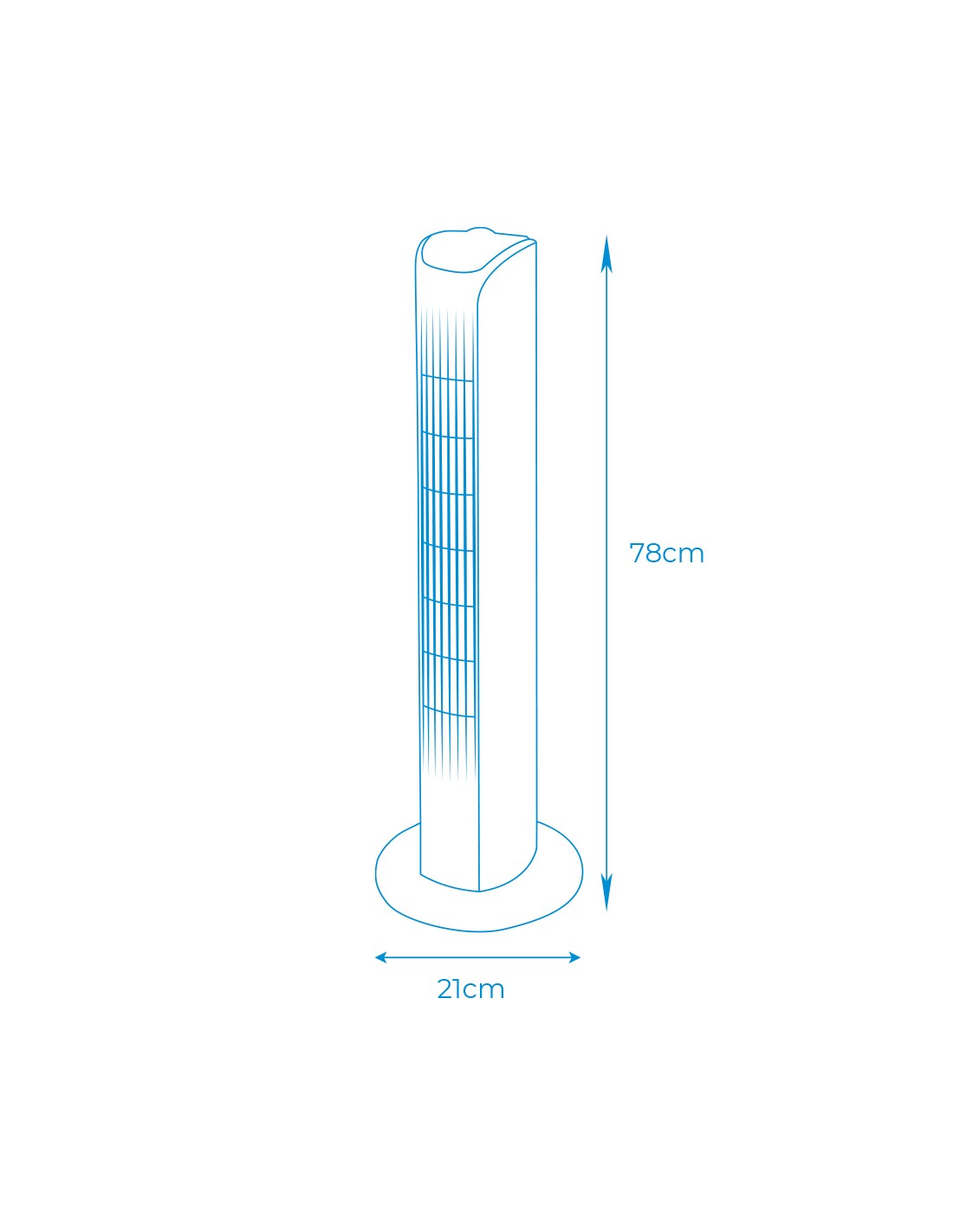 Ventilador de torre. color blanco. potencia: 45w 3 velocidades. medidas: 21 x 78 cm (ancho/alto) cabezal ajustable/oscilante 60° caudal aire 1920m/h. 60db, silencioso 220-240v - 50hz