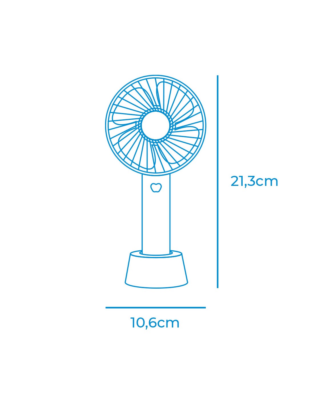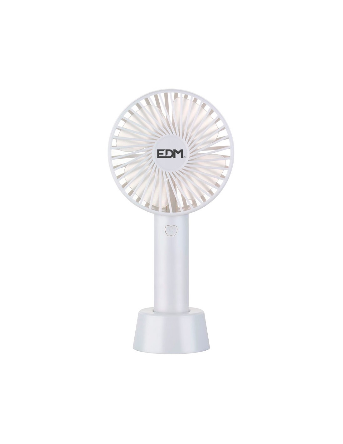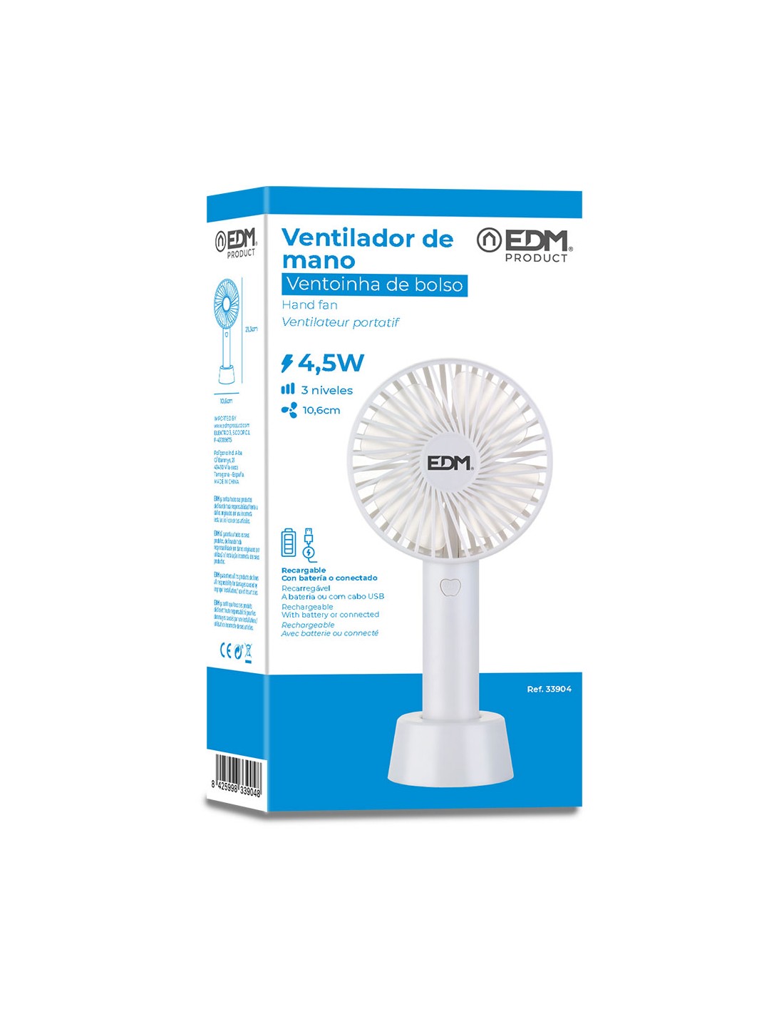 Ventilador de mano, recargable. 4,5w. 3 velocidades, bateria 2000mah recargable por puerto usb. rejilla de seguridad. no oscilante. tiempo de carga: 3h. autonomia hasta 5h. medidas: 10,6x6,5x22cm. edm