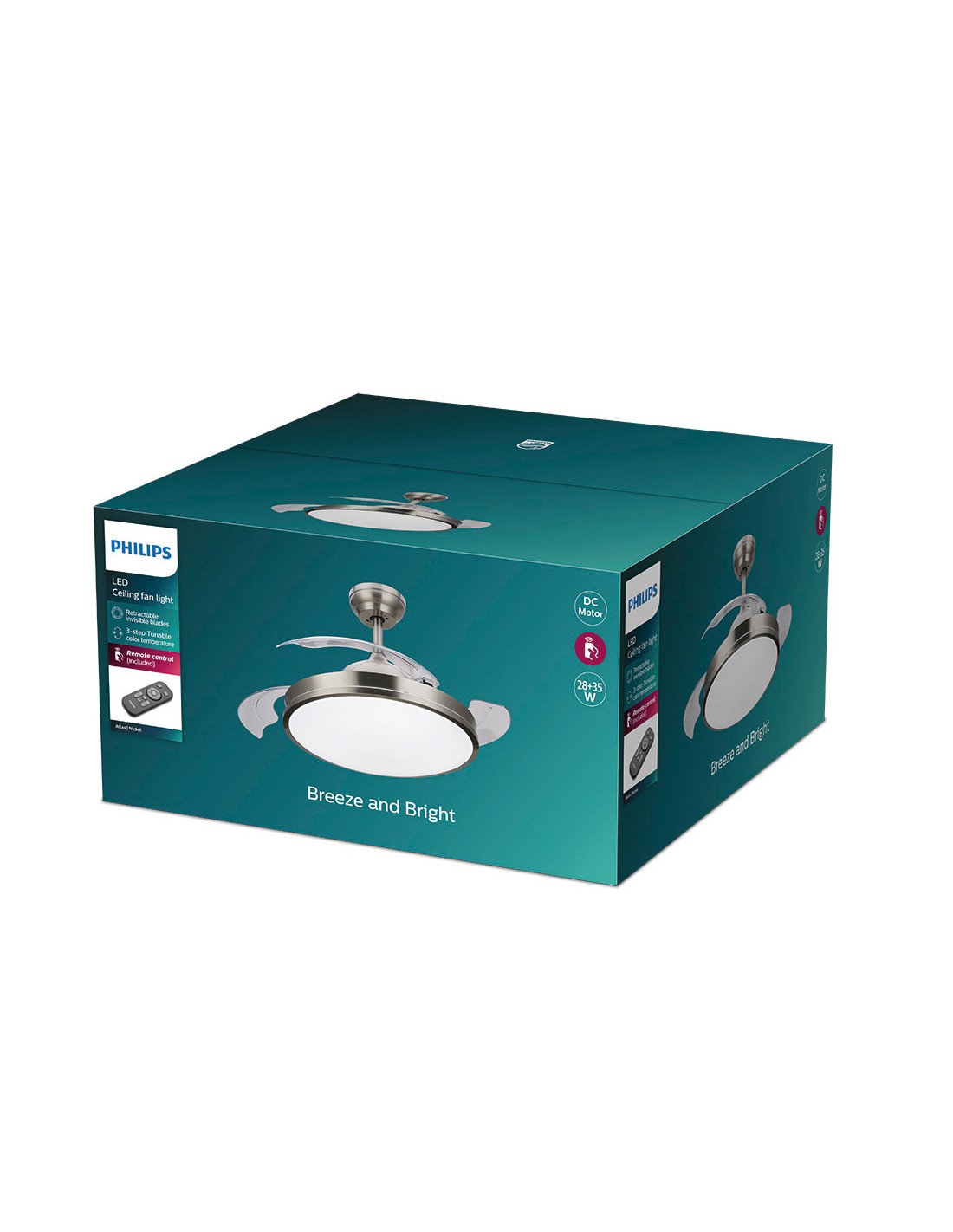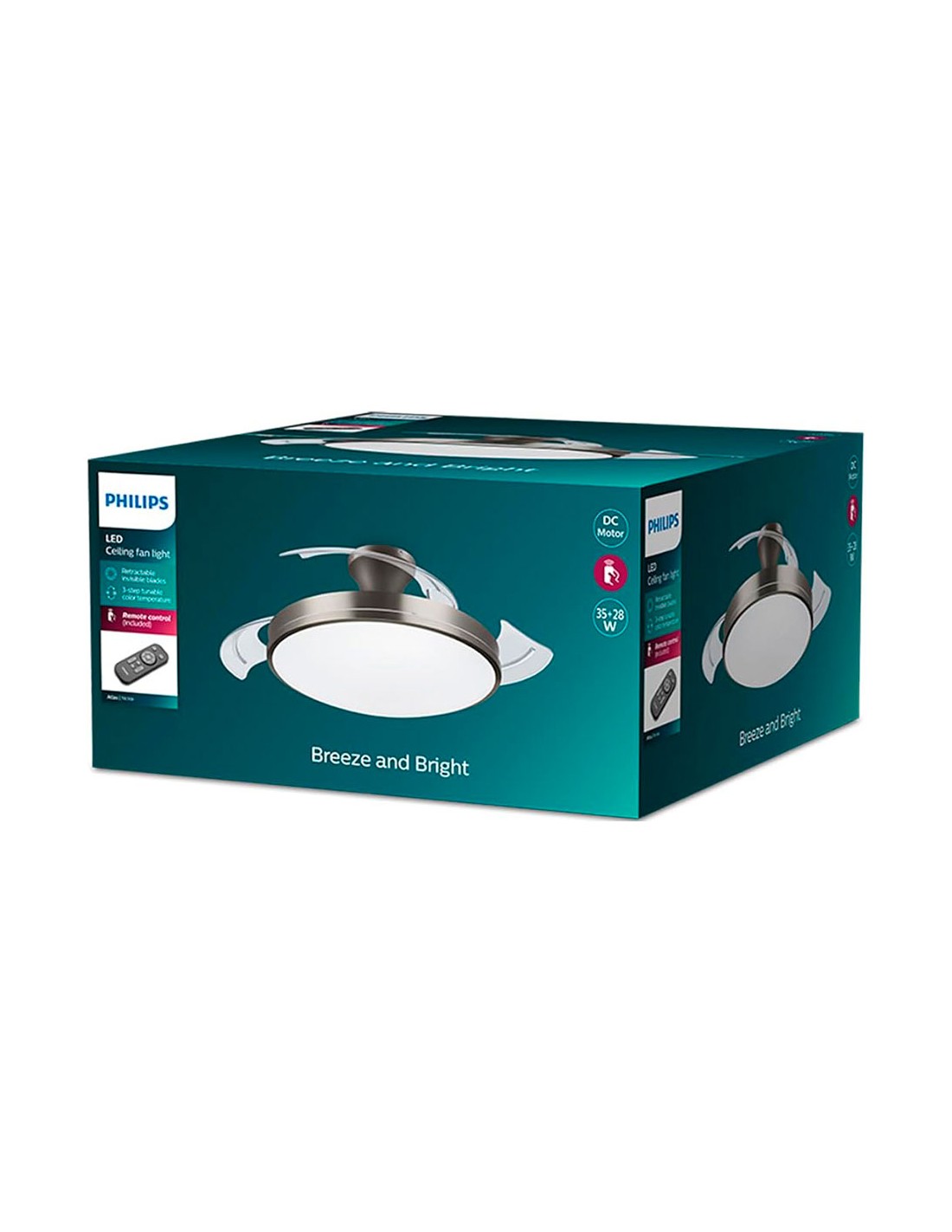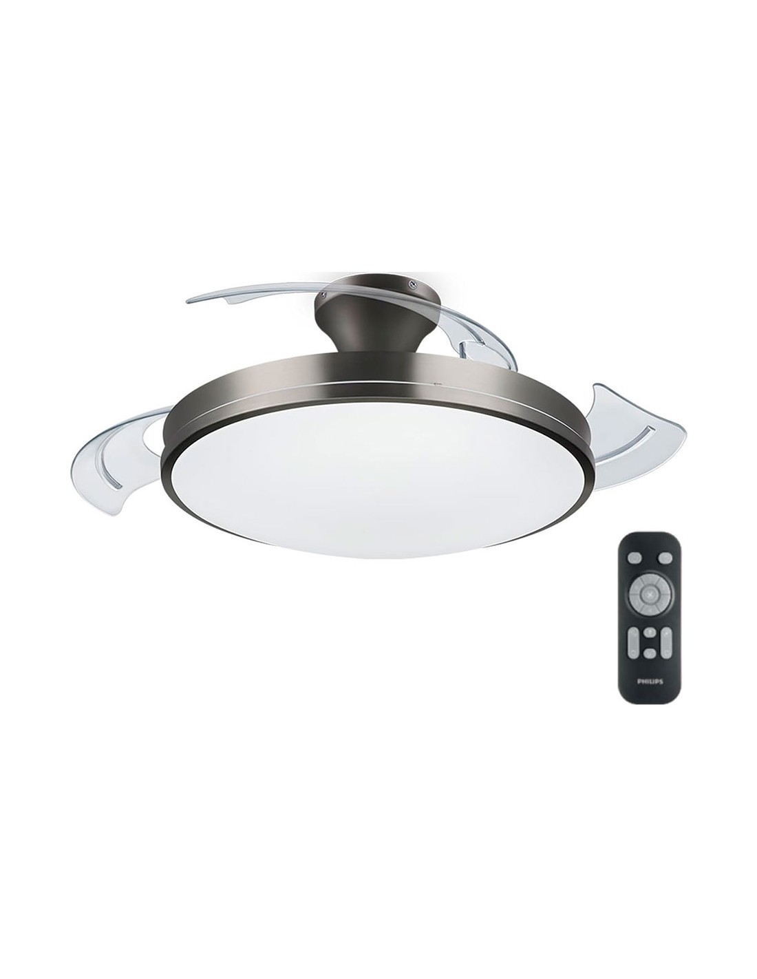 Ventilador de techo de led modelo atlas. color nikel potencia: 28+35w luz led con posibilidad de cambiar la tonalidad de luz 2700k-4000k-5500k aspas abatibles. mando a distancia. ø106cm 42,5db 230rpm philips