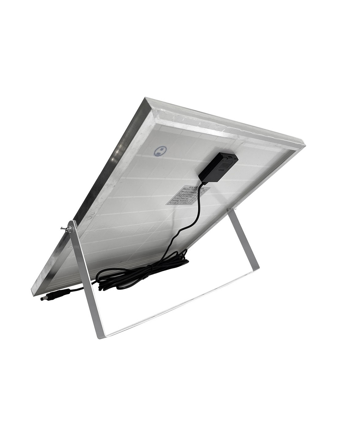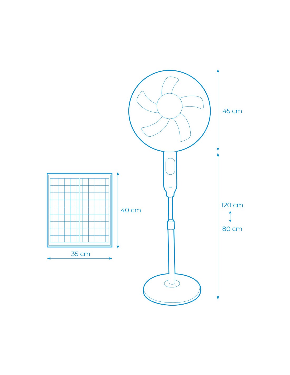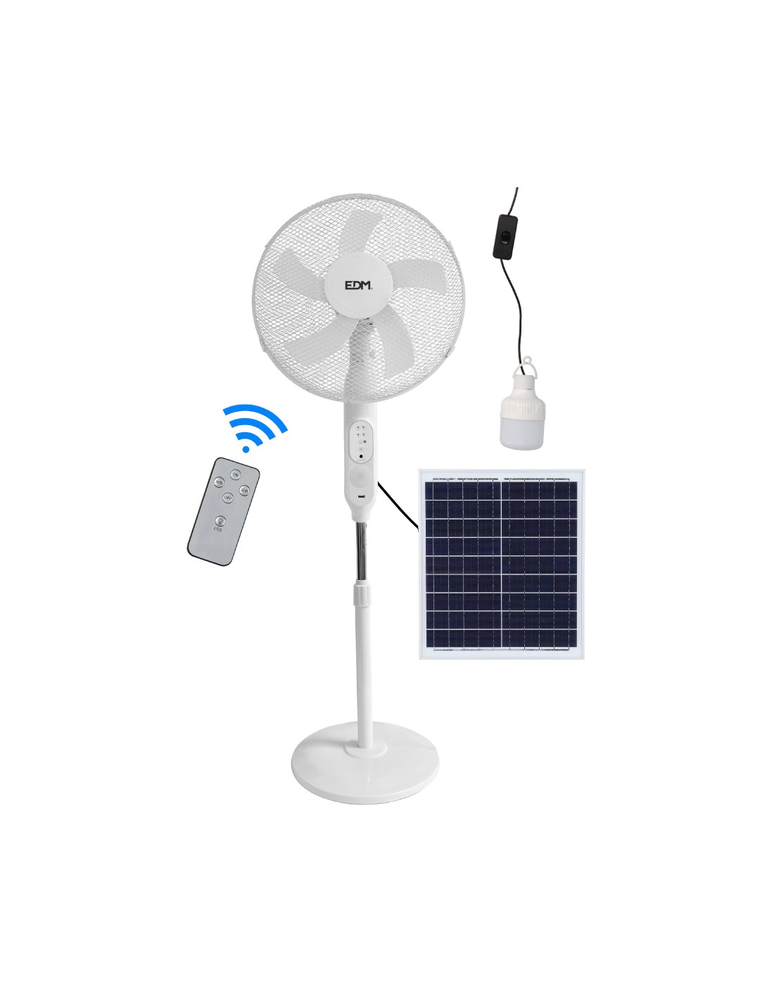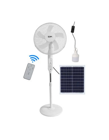Ventilador de pie solar 25w. aspas de 40cm. 3 velocidades. rejilla de seguridad. cabezal oscilante. altura regulable. pies antideslizantes. control con pantalla led o mando a distancia. bombilla de 5w y 400lm 6.400k con interruptor y entrada jack. panel solar de polisilicio de 20w 9v. cable de 293 cm.