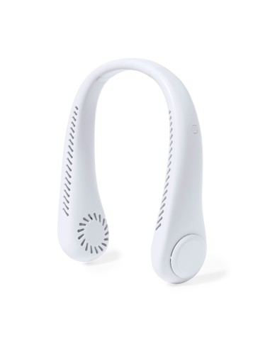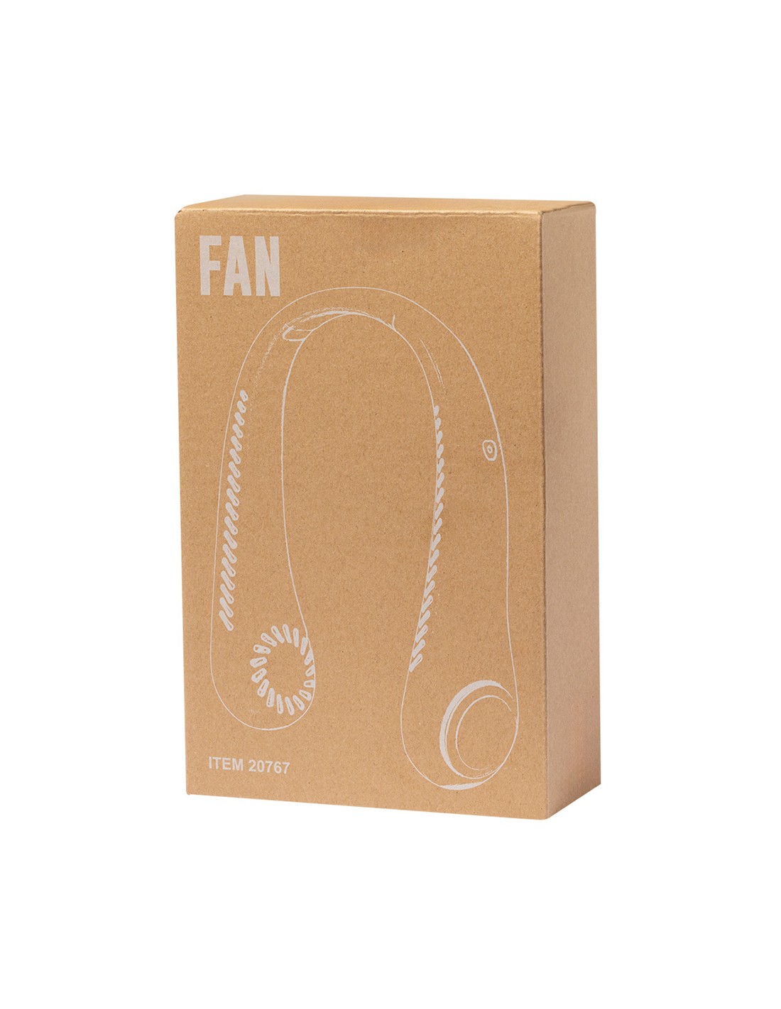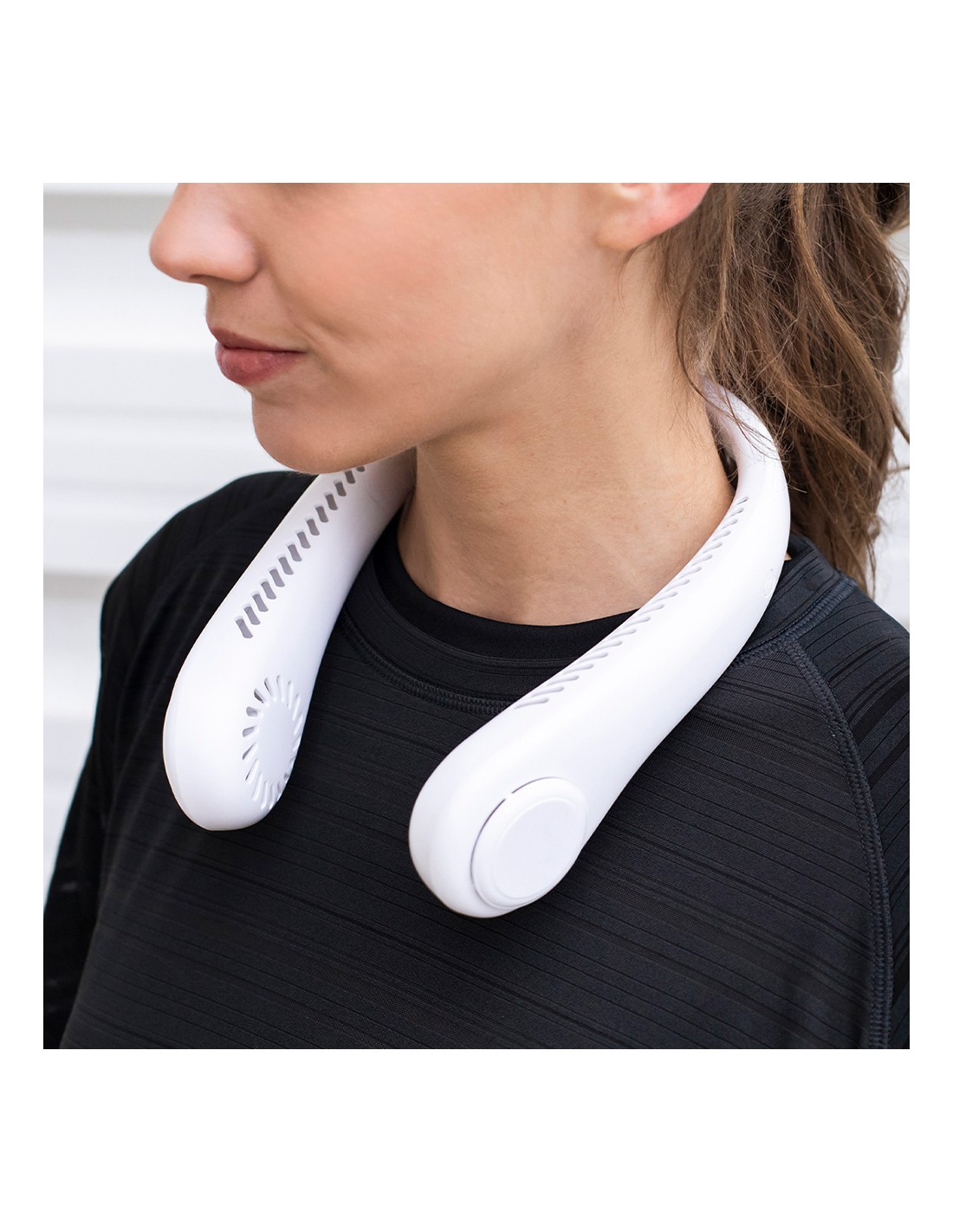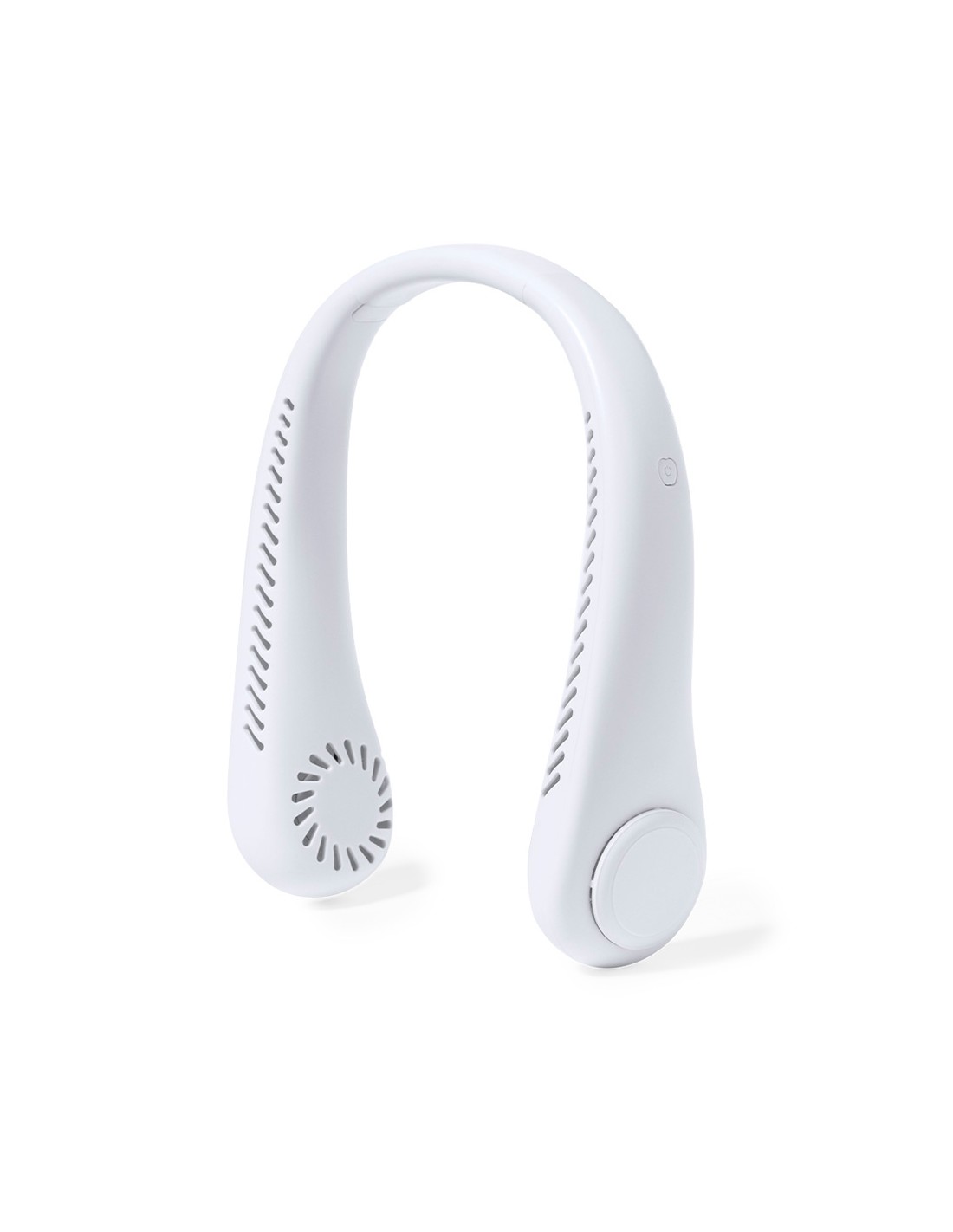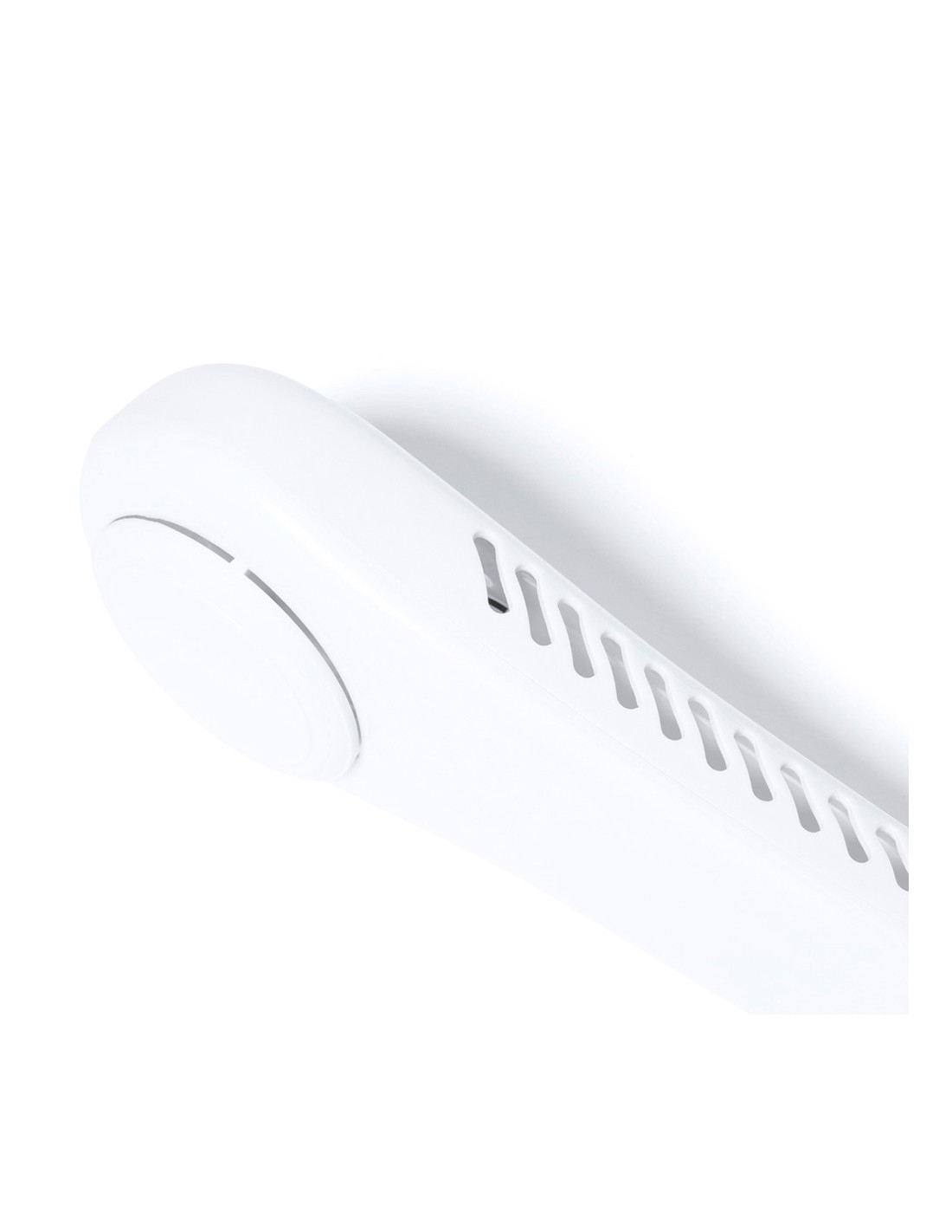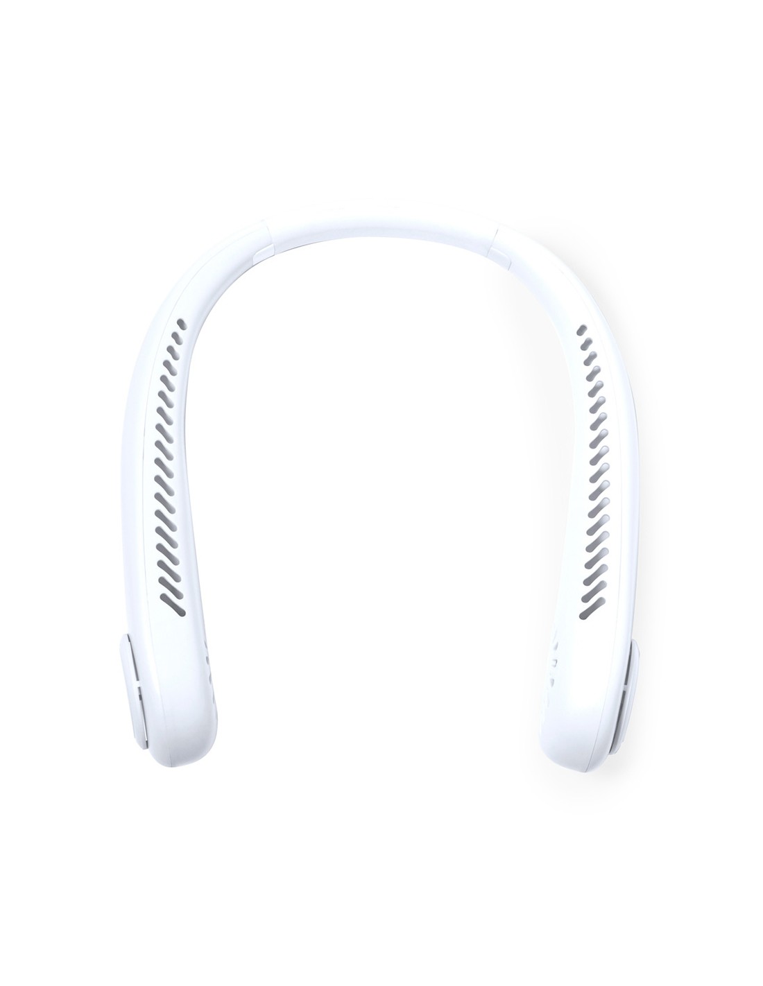 Práctico ventilador portátil fabricado en resistente abs. este elegante ventilador tiene un diseño en forma de collar para colocarlo alrededor del cuello, brindando una sensación refrescante. ofrece tres posiciones de velocidad diferentes y es recargable mediante su batería de 800 mah, cable micro usb incluido. presentado en caja de diseño kraft.3 posiciones. blanco. duración aprox a: máxima potencia 1h, potencia media 1h 30m, potencia baja 1h 45m. batería 800 mah. 14 x 22 x 6.2 cm.