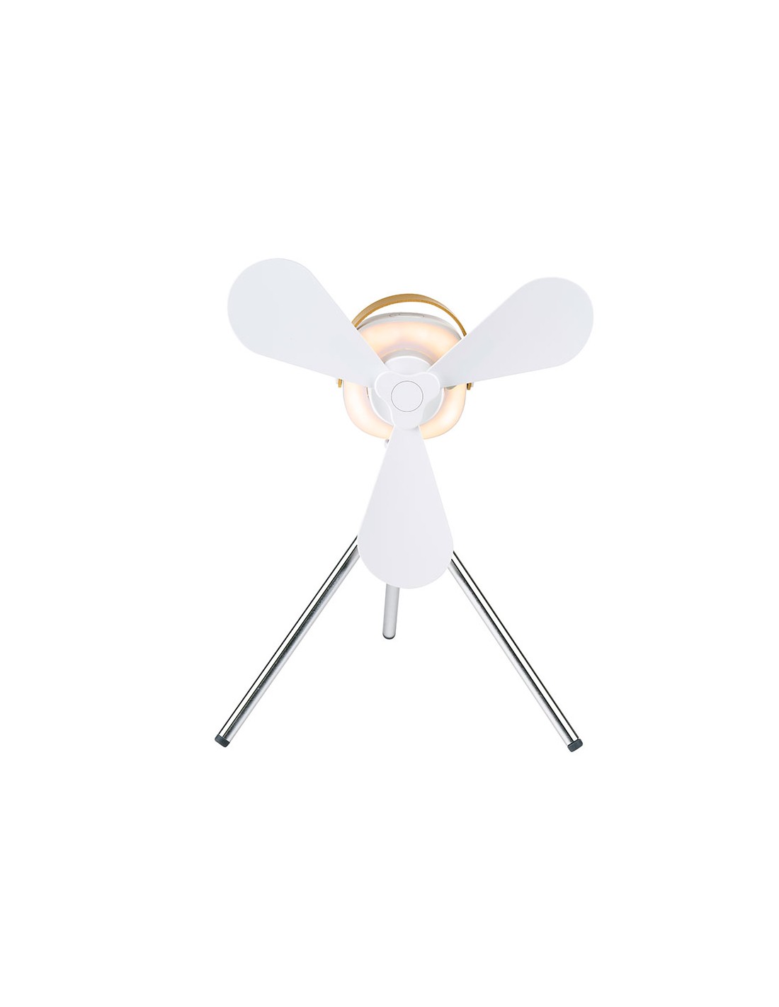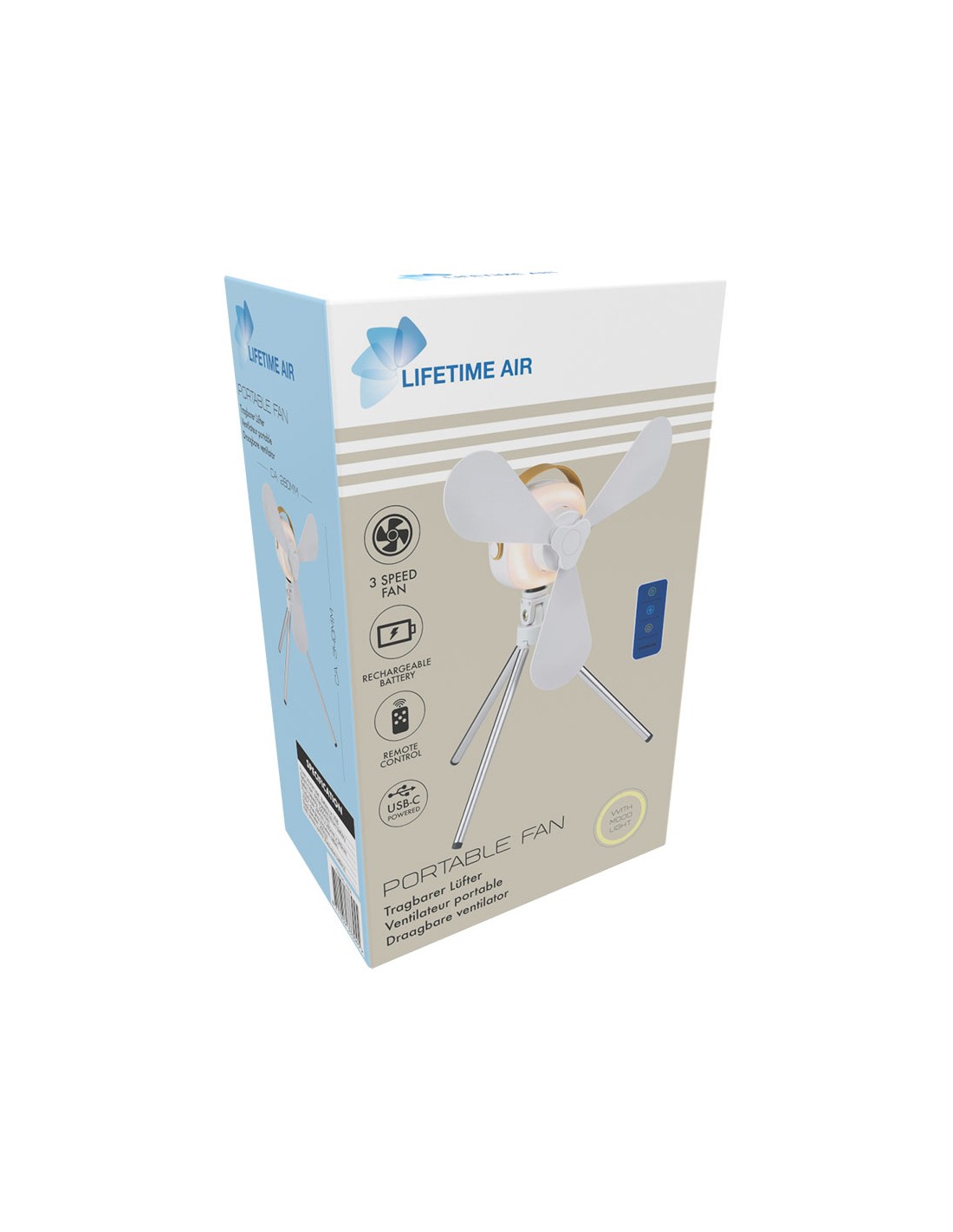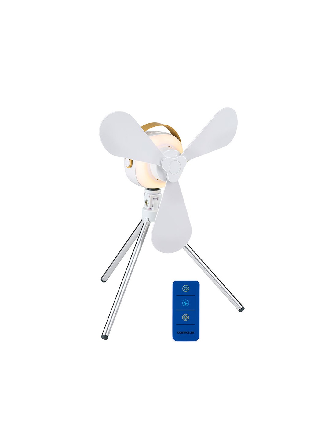 Ventilador portátil con 3 aspas ø 26 cm. recargable con usb, batería de 2200 mah. dispone de 4 velocidades regulables a través del control remoto (incluido). con luz cálida (3 niveles de brillo). con asa para colgar y trípode. contiene cable de carga usb-c. dimensiones: 28 x 28 x 34 cm (con trípode incluido). pila mando a distancia cr2025 no incluida