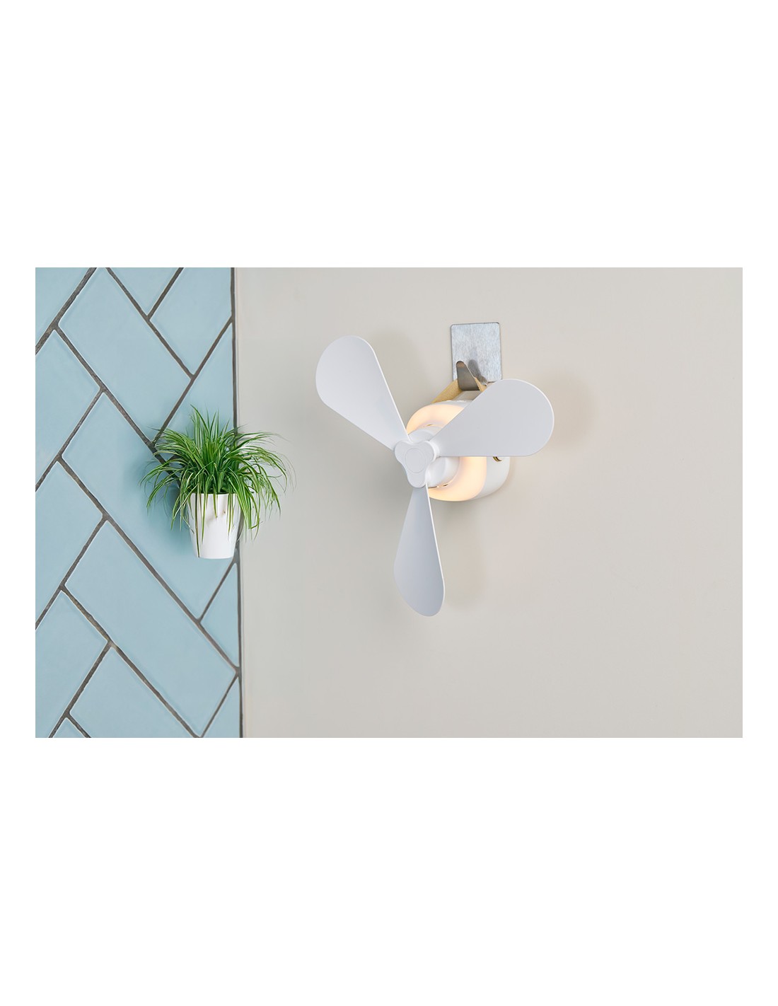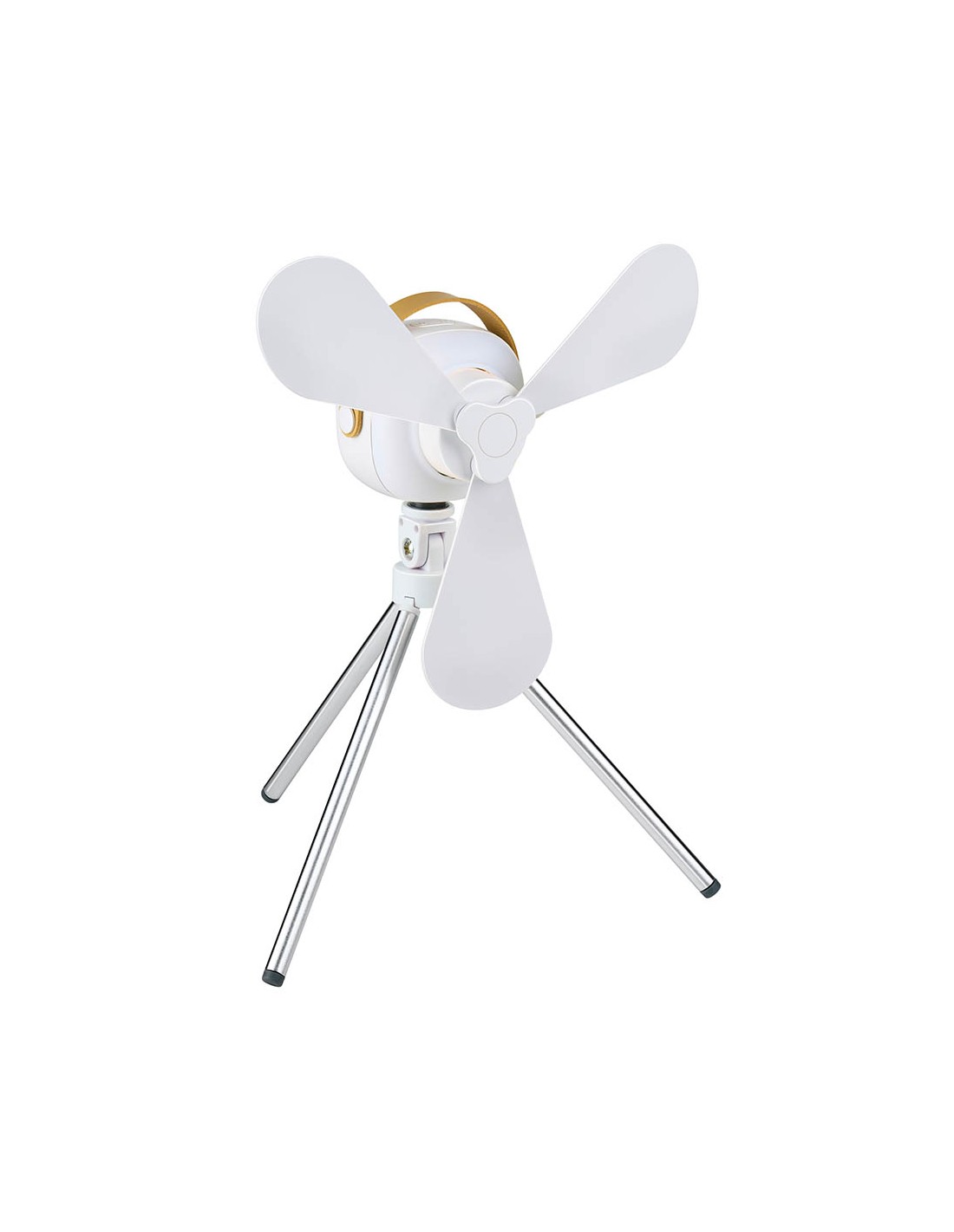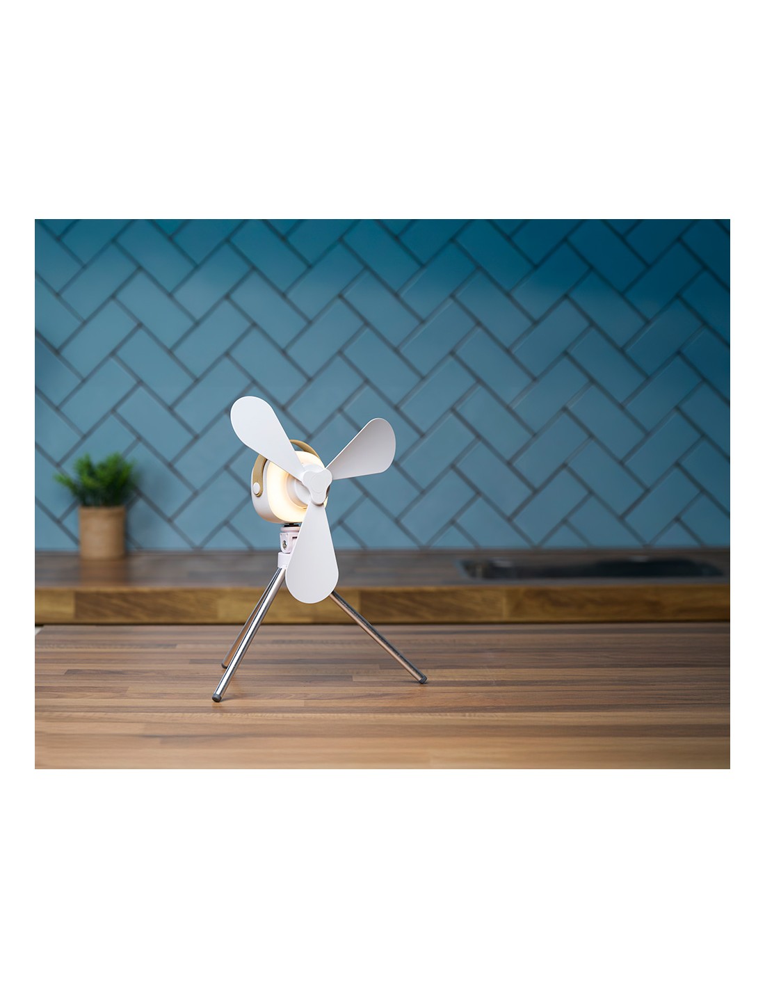 Ventilador portátil con 3 aspas ø 26 cm. recargable con usb, batería de 2200 mah. dispone de 4 velocidades regulables a través del control remoto (incluido). con luz cálida (3 niveles de brillo). con asa para colgar y trípode. contiene cable de carga usb-c. dimensiones: 28 x 28 x 34 cm (con trípode incluido). pila mando a distancia cr2025 no incluida