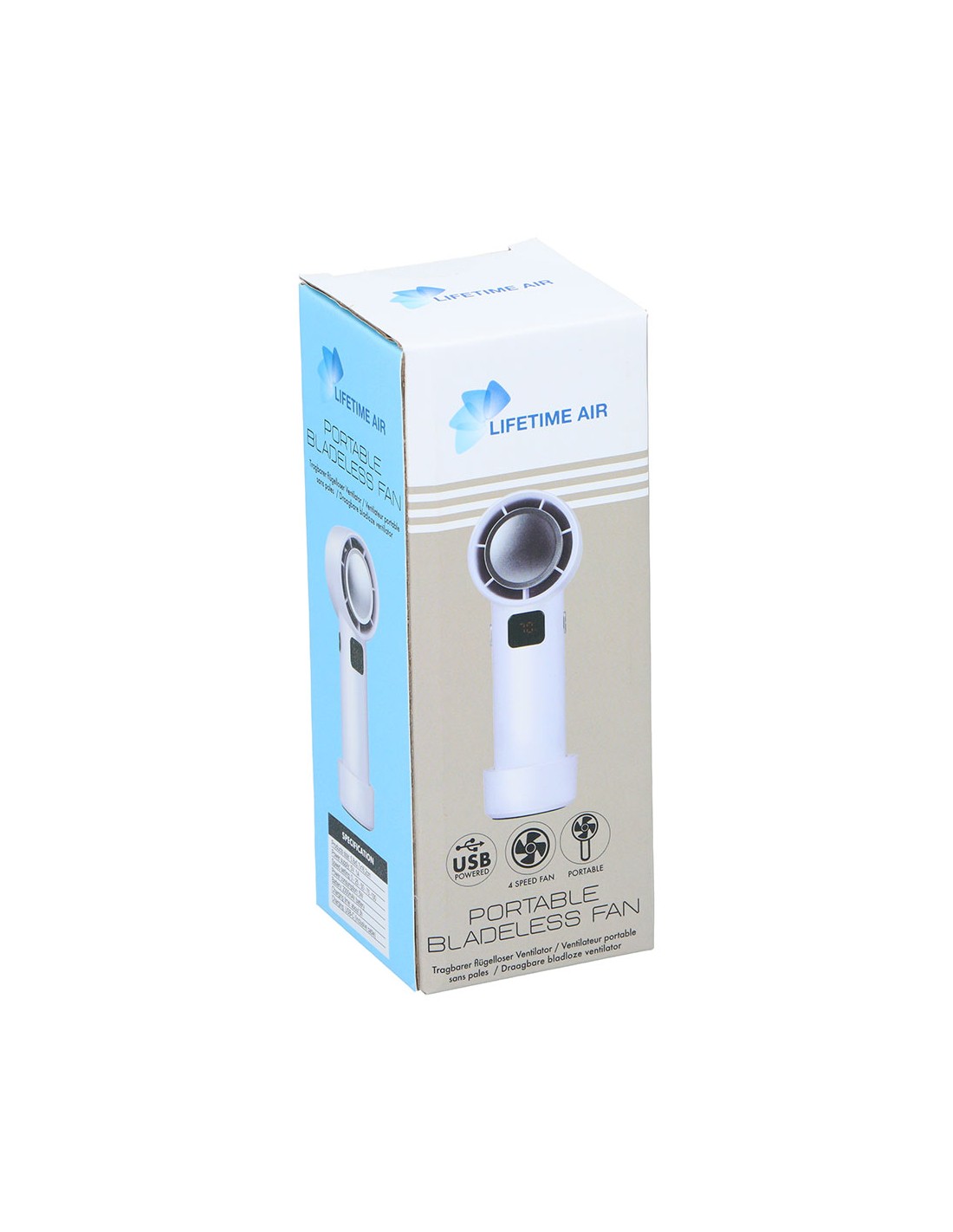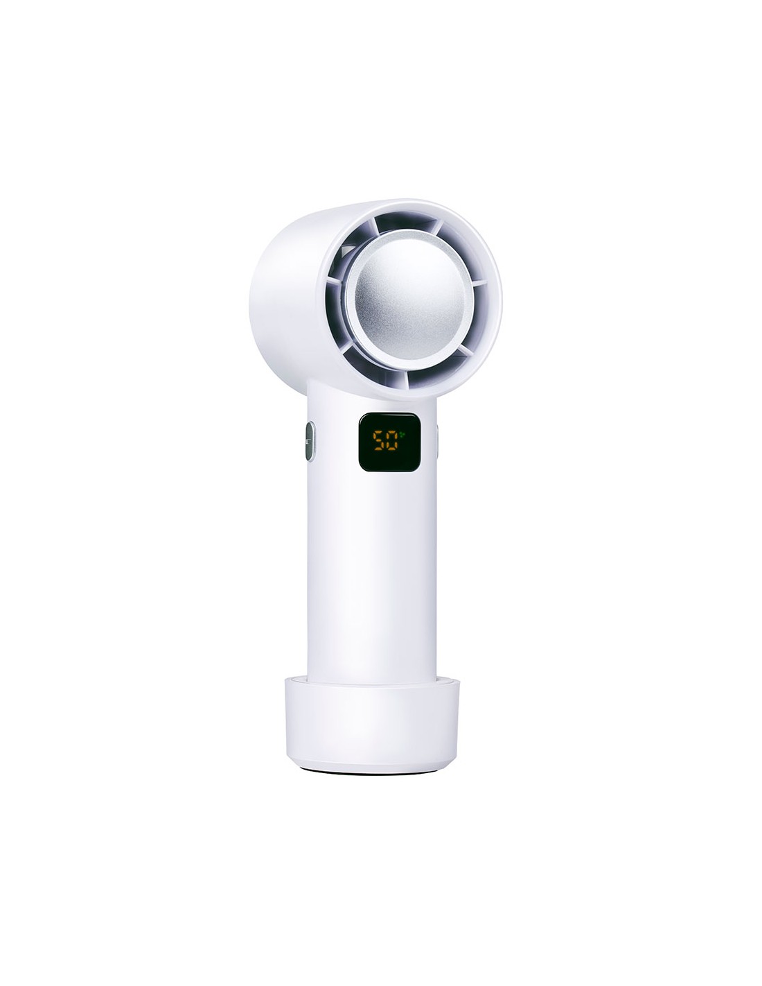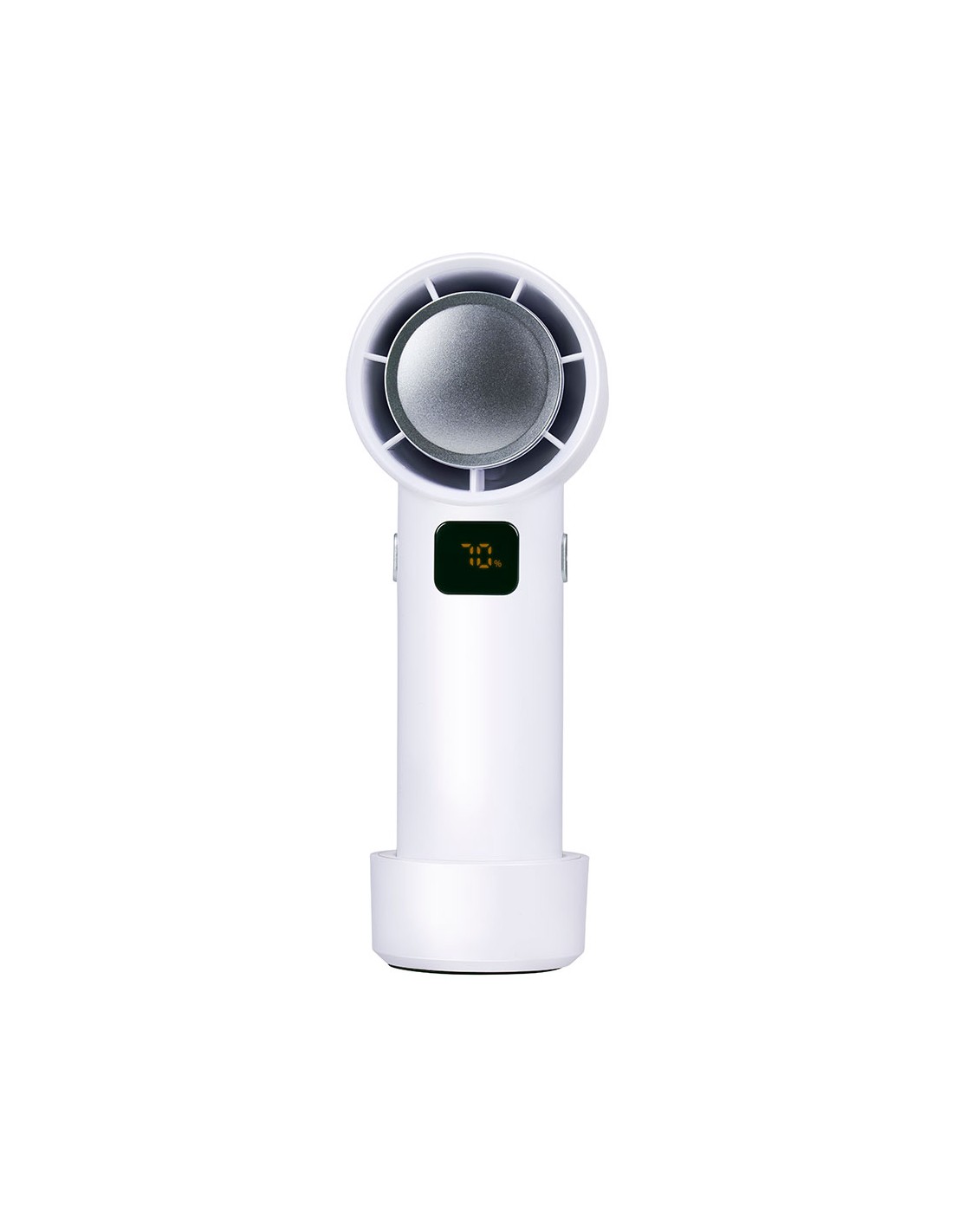 Ventilador portátil sin aspas recargable con cable usb incluido 5 velocidades con pantalla led para indicar bateria y velocidad con base antideslizante y desmontable medidas 5,5 x 5,5 x 16 cm