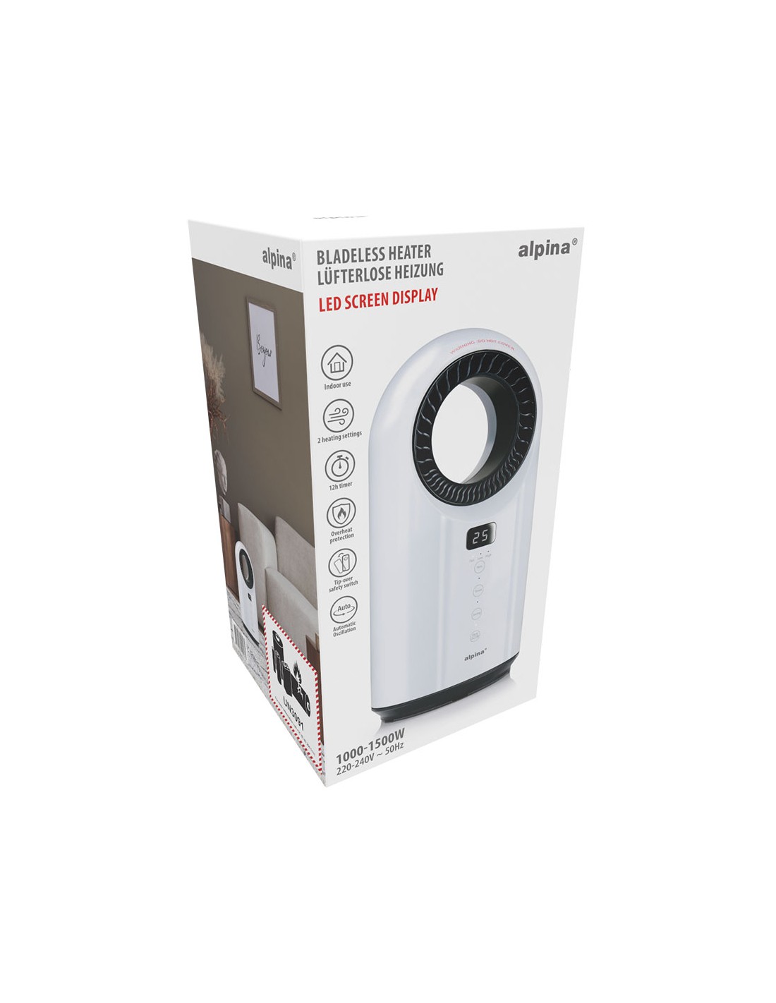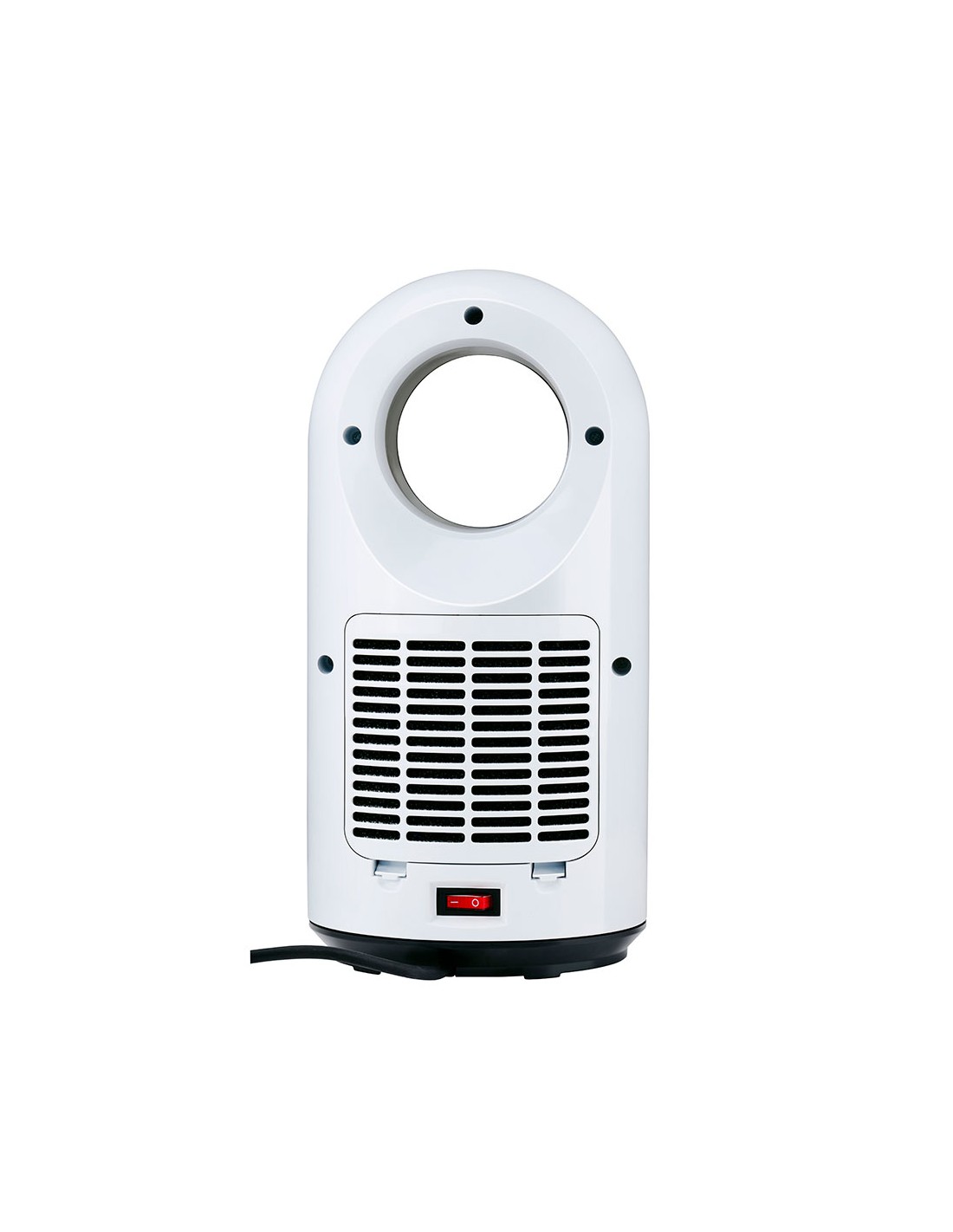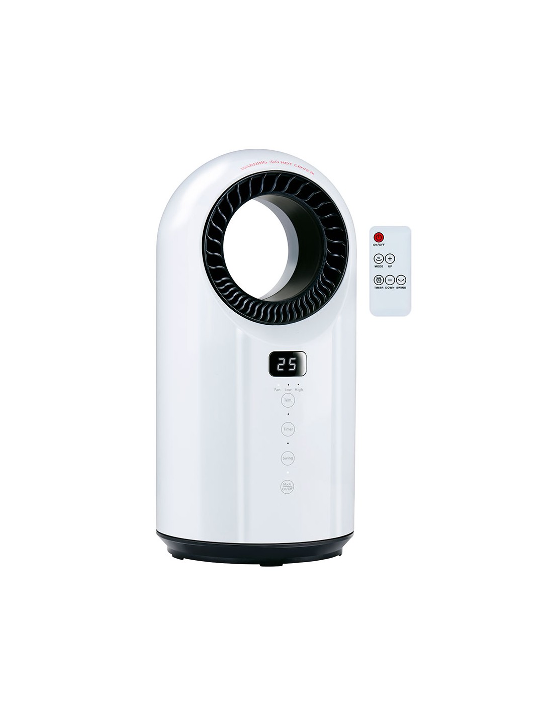 Ventilador sin aspas con calefactor 1000 - 1500 w. tensión: 220-240~50hz. con control táctil y control remoto oscilanción horizontal automática 2 niveles de potencia. temporizador de 12 horas protección contra sobrecalentamiento cable de alimentación de 1,5 m protección antivuelco 18 x 18 x 36,9 cm