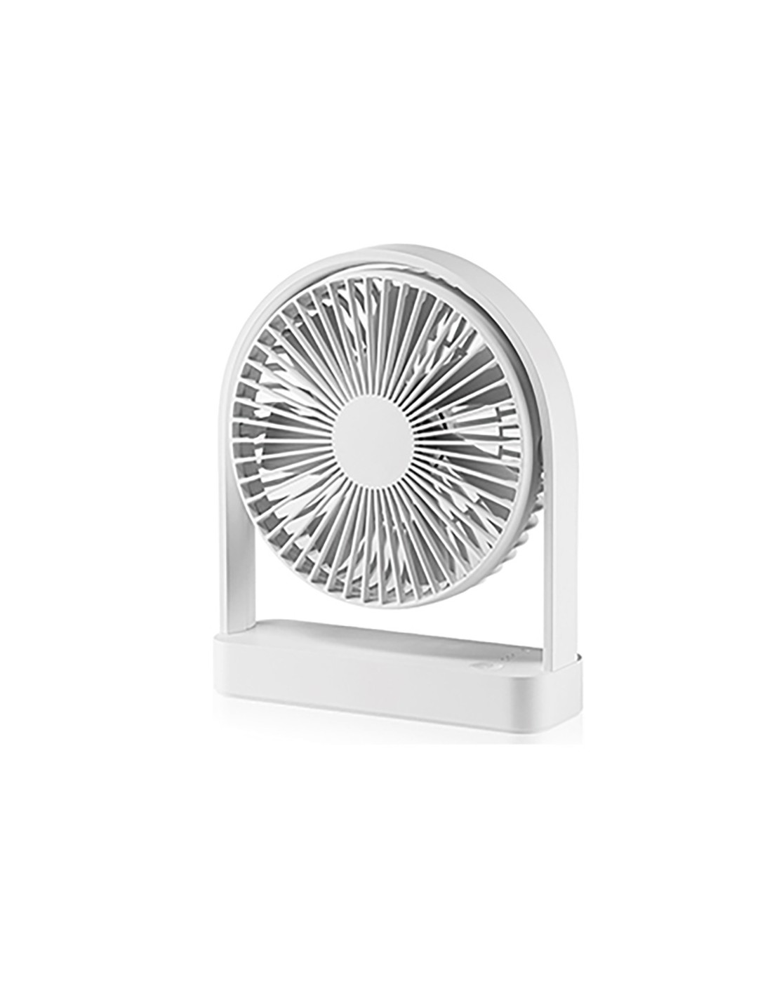 Ventilador de mesa recargable compacto y potente cuenta con una rejilla protectora de las aspas para mayor seguridad, 3 velocidades permite su colocación en superficies planas al contar con una base, para espacios reducidos 2000 mah, tiempo de trabajo 1,5 - 6,5 h ( según velocidad) tiempo de carga 3 h blanco dimensiones 173 x 56 x 209 mm