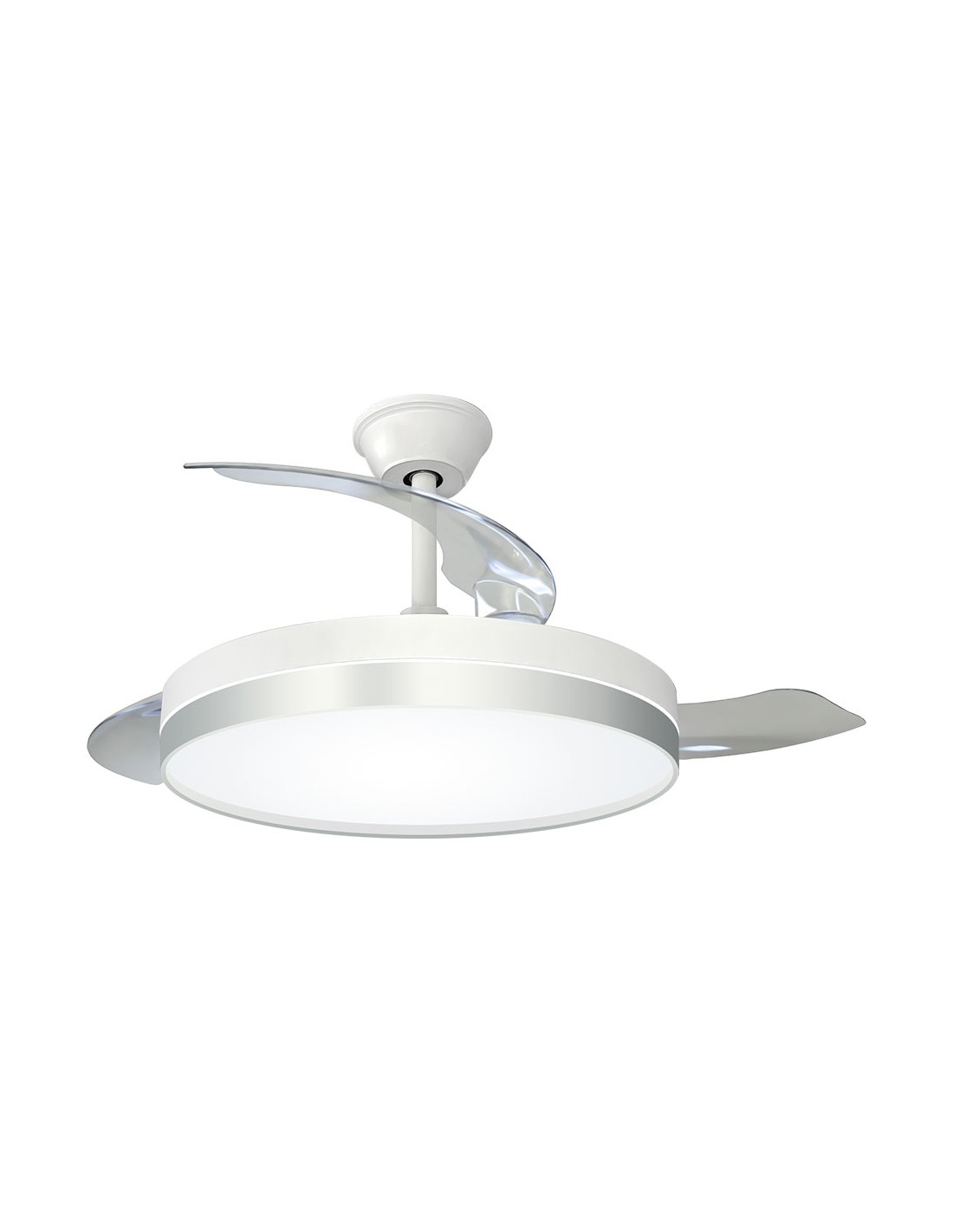 Ventilador de techo, plateado, 3cct, silencioso, con 3 aspas transparentes retráctiles. motor dc, 36 w. tipo de luz: luz cálida 3000 k, luz día 4000 k, luz fría 6500 k, 4100 lm, 6 velocidades. función inversa función verano las aspas giran en sentido contrario a las agujas del reloj y función invierno giran en el sentido de las agujas del reloj. incluye mando a distancia flujo de aire máximo 6141 m/h tensión 220-240 v~50hz. dimensiones con aspas abiertas 107 x 31 cm con aspas cerradas 48,7 x 31 cm