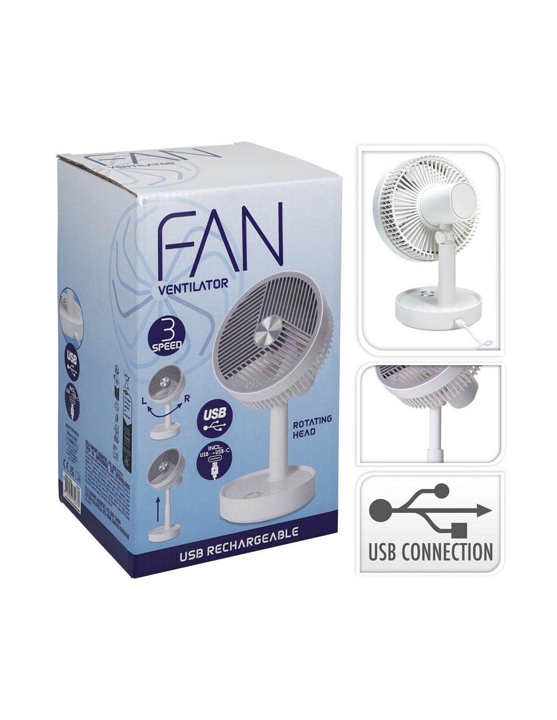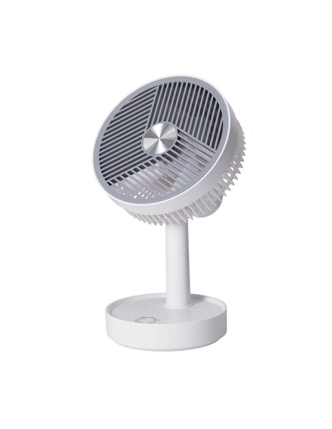 Ventilador de sobremesa, con 3 velocidades, recargable, fabricado en abs/pp, altura regulable máx. 270 mm, oscilante e inclinable, batería de iones de litio 18650 3.7 v 1200 mah. incluye cable de carga usb tipo c - color blanco y gris - dimensiones ventilador: ø135 x 270 mm y base de ø110 mm