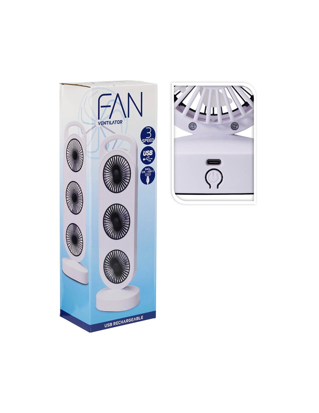 Ventilador de sobremesa, con 3 velocidades, recargable, fabricado en abs, con asa incorporada, batería de litio 18650 de 1200 mah 3,7 v. incluye cable de carga usb-c - color blanco con detalles en negro