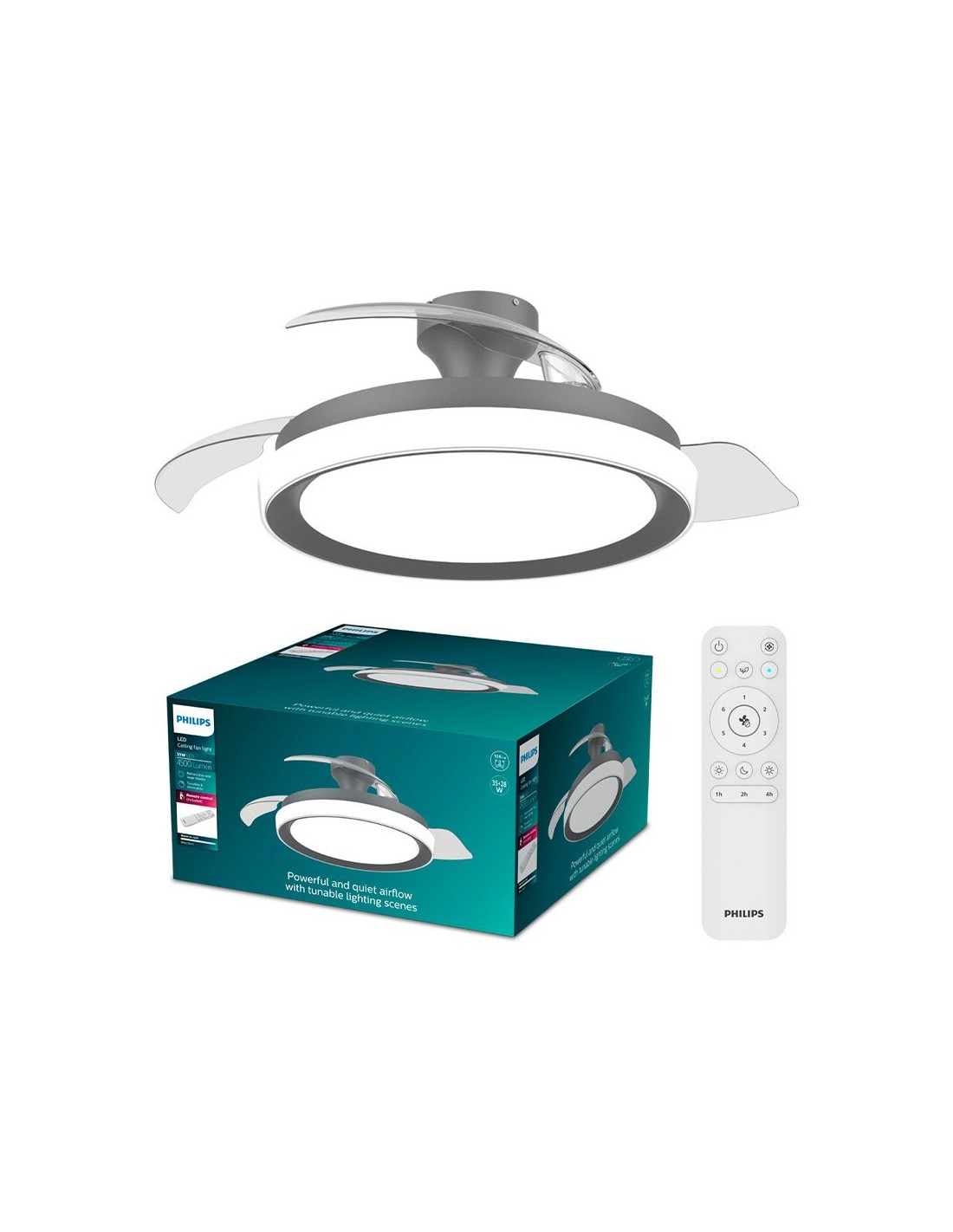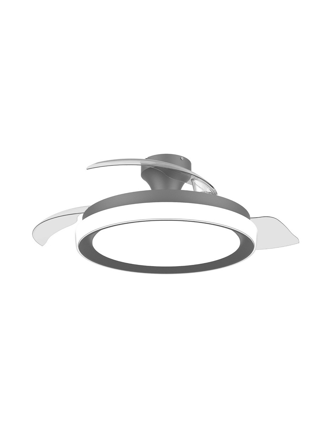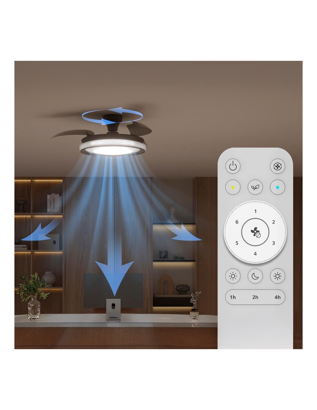 Ventilador de techo led 3 cct, color negro, modelo bliss, con aspas retráctiles transparentes, 35 w, 4500 lm, tipo de flujo luminoso 360°, 3 tonos de luz: 2700 - 4000 - 6500 k, con intensidad regulable, luz nocturna, vida útil nominal 15.000 h, flujo de aire natural + 6 velocidades, función inversa invierno-verano, motor ultra silencioso dc 28 w, función temporizador: 1 / 2 / 4 h, tensión: 220-240 ca, ip20, con mando a distancia (pilas no incluidas), incluye elementos de fijación. dimensiones con aspas: ø106 x 29 cm, plafón ø51 cm
